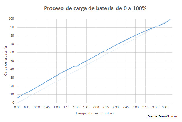 La carga de la batería de cero a cien con un cargador estándar lleva cerca de cuatro horas, y el proceso de carga es bastante lineal, como puede apreciarse en la gráfica.