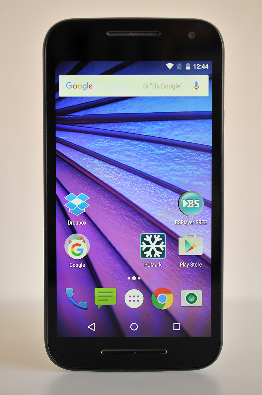 El frontal del Moto G (2015) resulta poco atractivo, ya que su aspecto es muy parecido al de otros teléfonos Android «del montón». Ni siquiera está presente el logotipo de Motorola, por lo que podría pasar por un teléfono de cualquier otra marca.