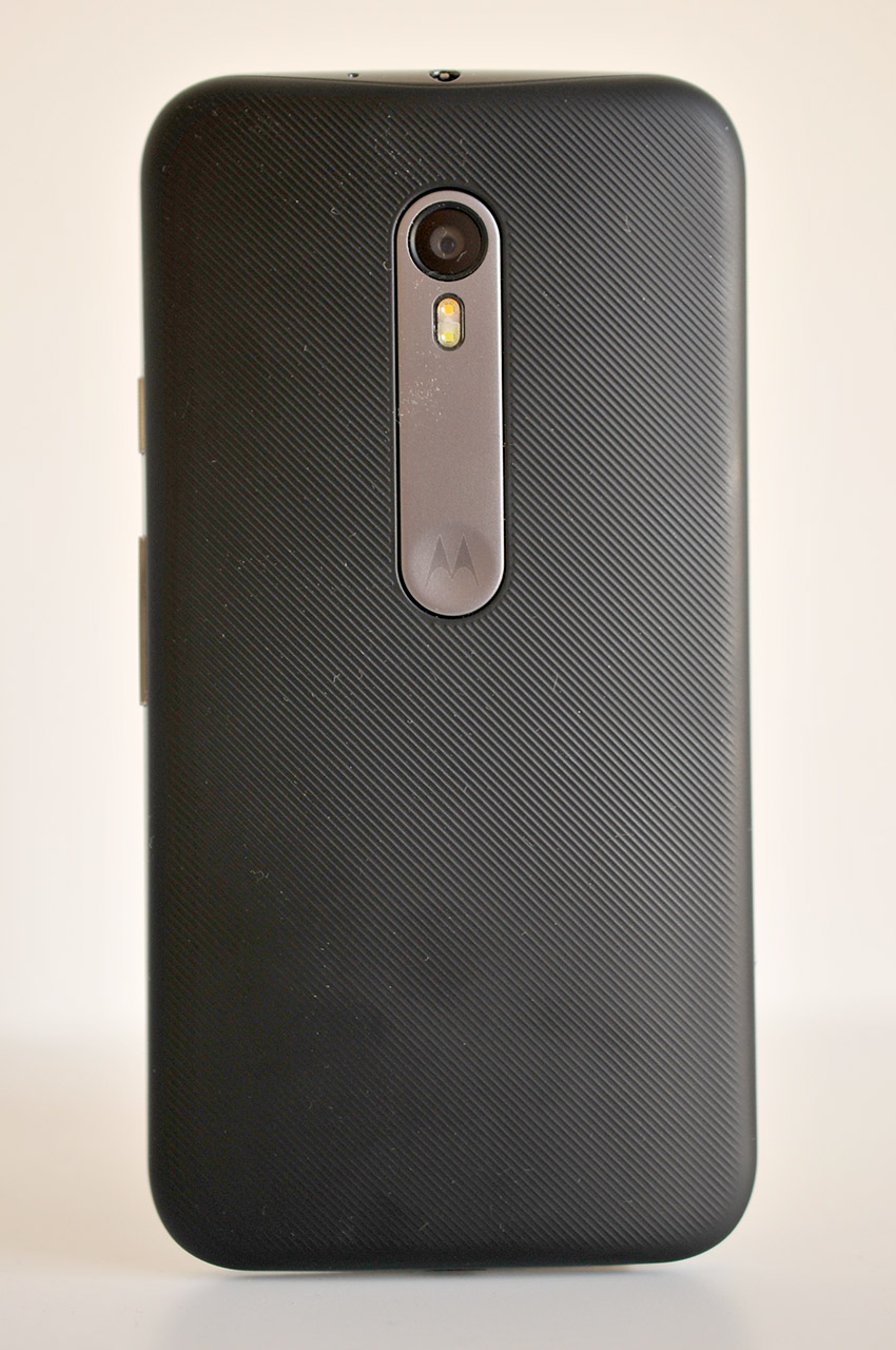 La cubierta trasera es el aspecto visual del teléfono que más ha variado respecto al Moto G (2014). En los modelos anteriores el logotipo de Motorola estaba en un hueco circular que quedaba hundido respecto a la superficie de la carcasa. Sin embargo, Motorola ha adoptado un nuevo diseño en sus últimos teléfonos donde la cámara, el flash y el logotipo están unidos por un tira de plástico de aspecto metálico que queda ligeramente hundida.