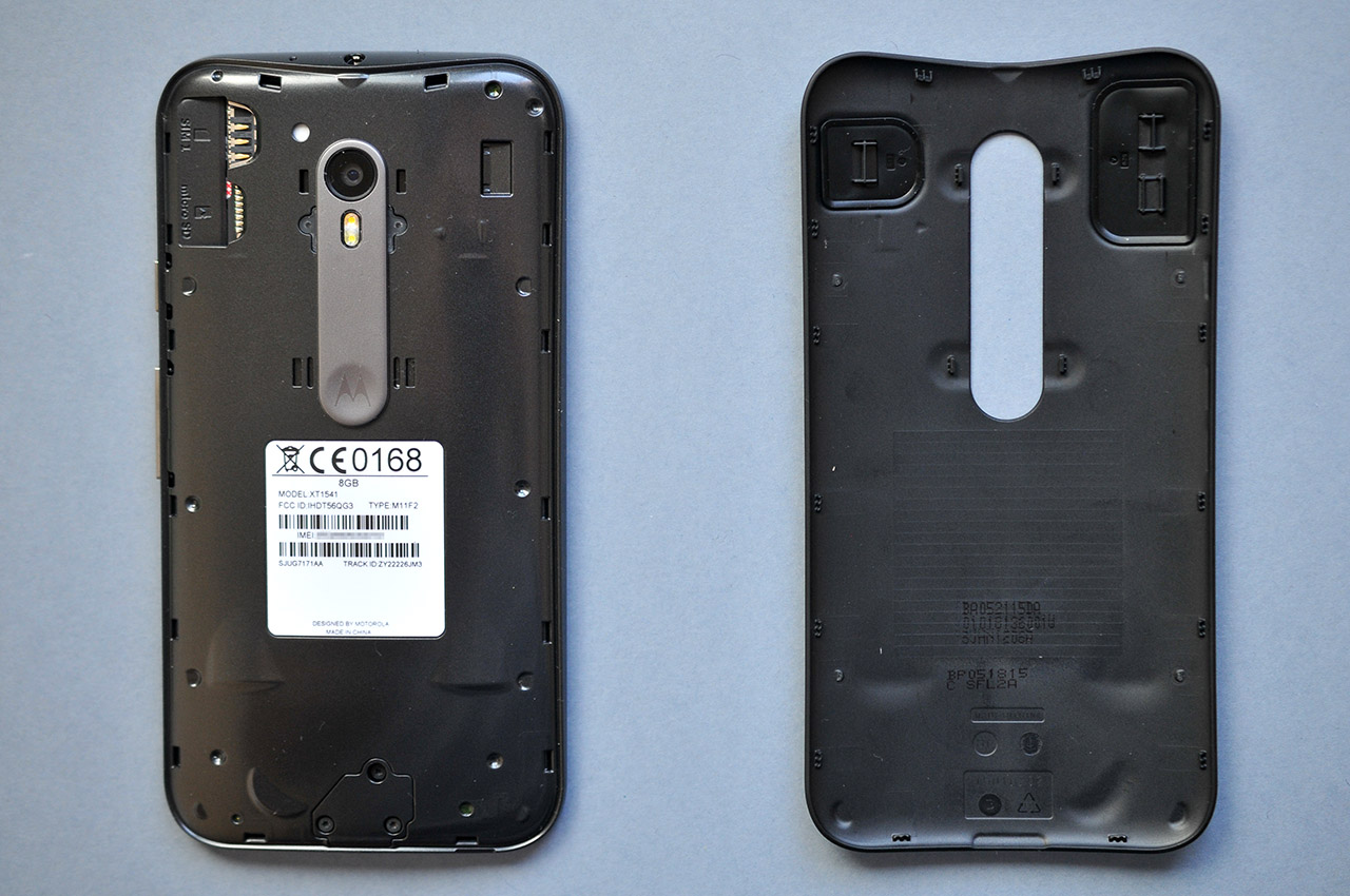 En el interior del teléfono encontramos una ranura para tarjeta micro-SIM y otra ranura para tarjeta micro-SD. Como hemos comentado anteriormente, la carcasa trasera puede ser sustituida por otras que comercializa Motorola en variados colores. La batería no puede extraerse, como ya ocurría en el Moto G (2014) del año pasado.