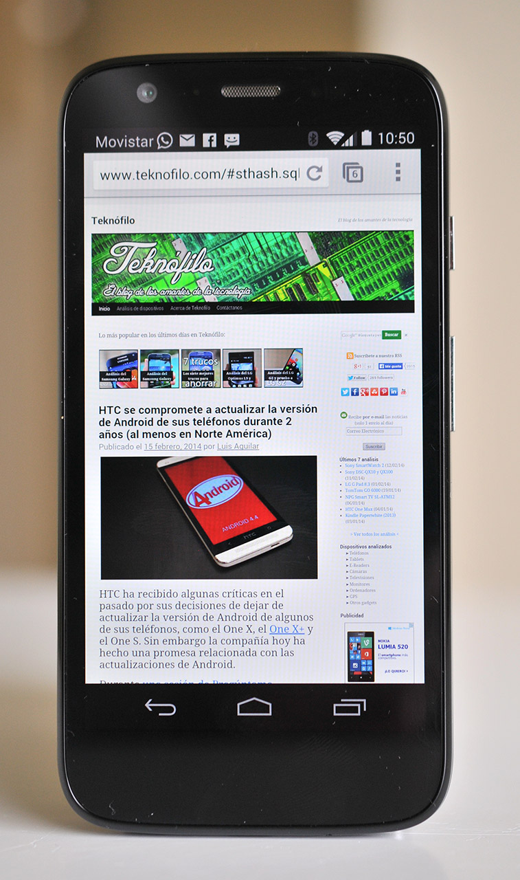 Las páginas webs con gran cantidad de elementos gráficos como The Verge se cargan rápidamente en el Moto G, y podemos desplazarnos y hacer zoom hacia dentro/fuera con una gran fluidez.