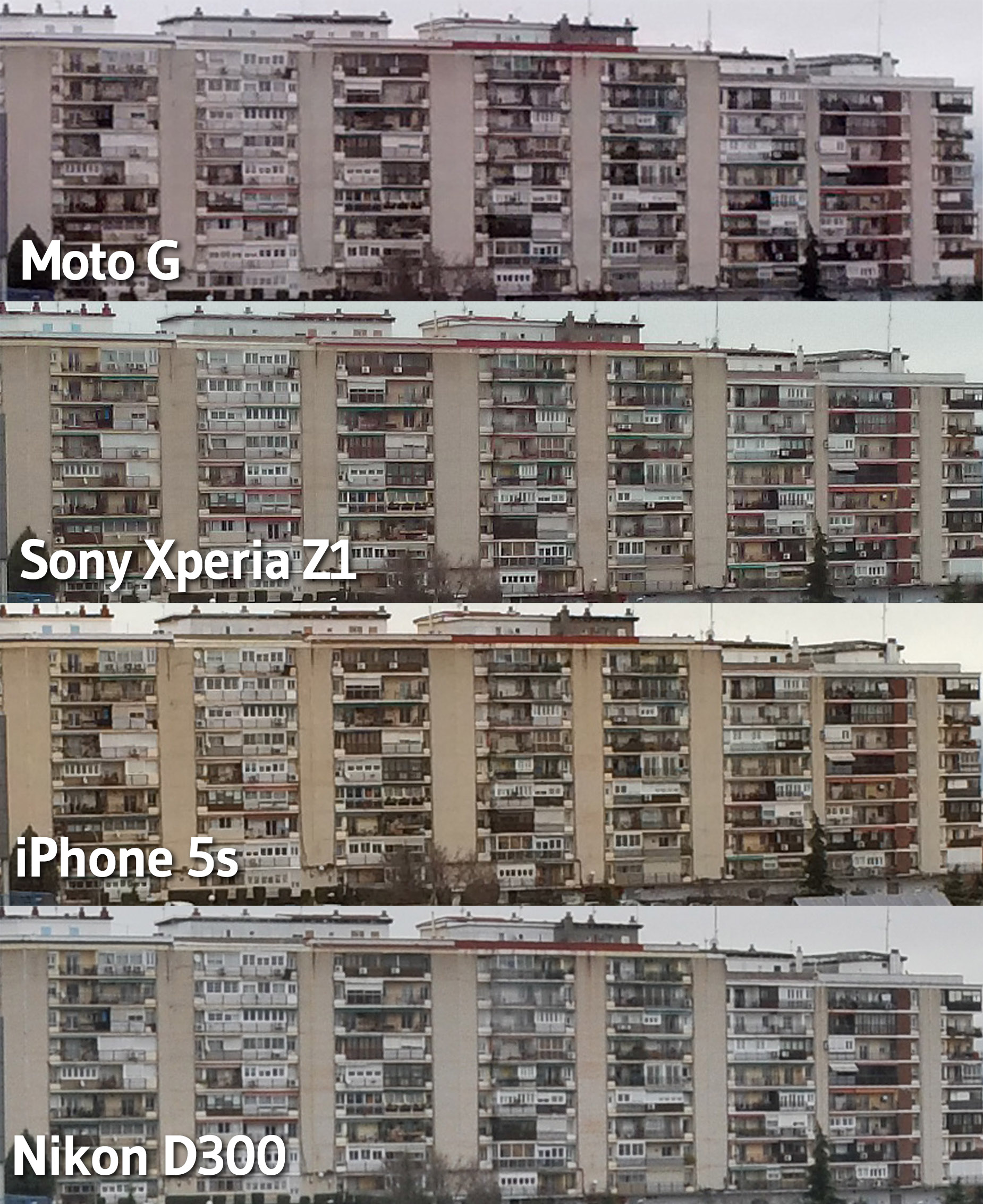 A continuación podemos ver una misma imagen capturada por el Moto G (5 MP), el Sony Xperia Z1 (20,7 MP), el iPhone 5s (8 MP)  y una cámara réflex Nikon D300 (12 MP).