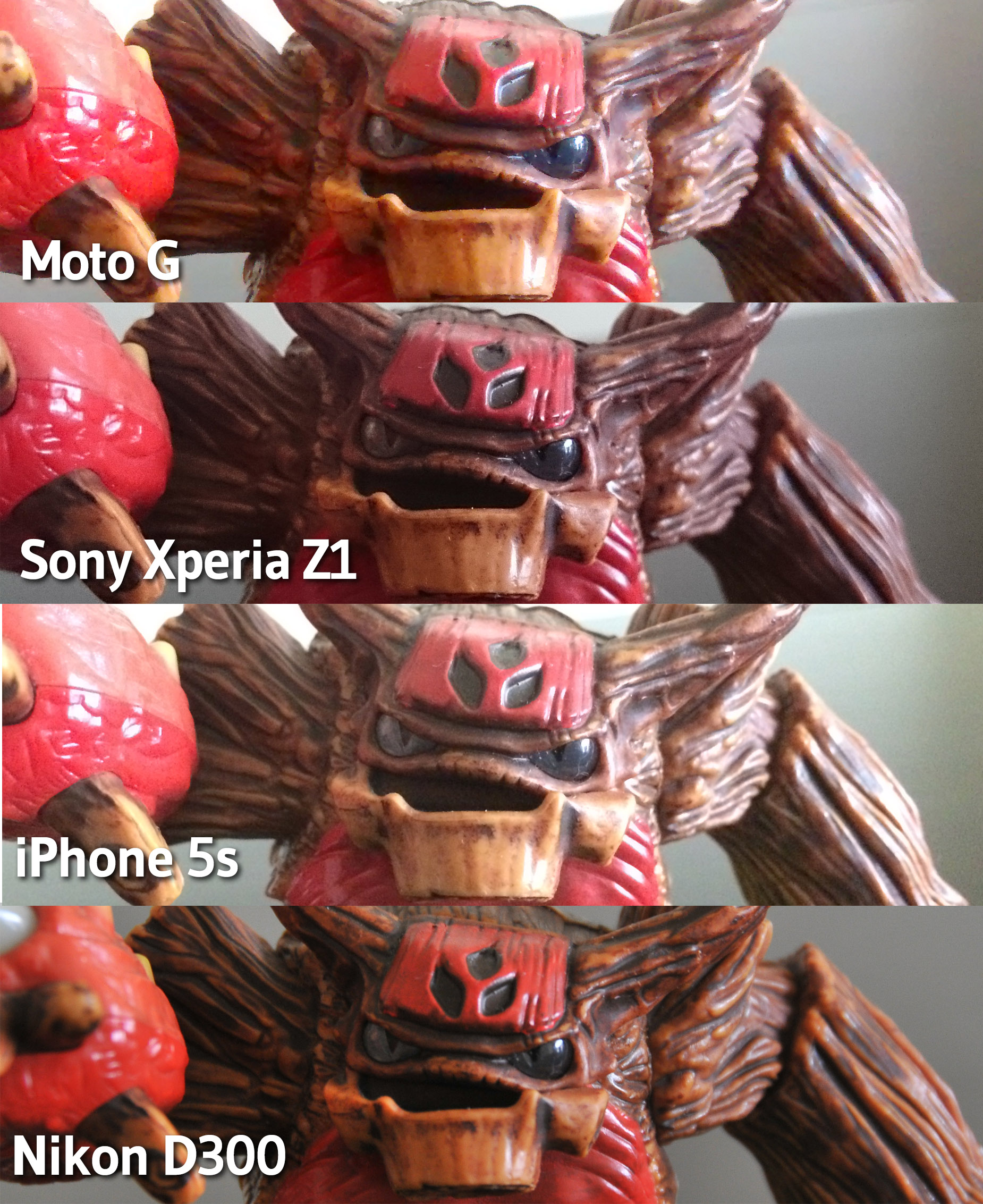 Como se puede apreciar en la siguiente comparativa, la imagen capturada por el Moto G posee menos detalle que las otras dos ya que el algoritmo de reducción de ruido es más agresivo.