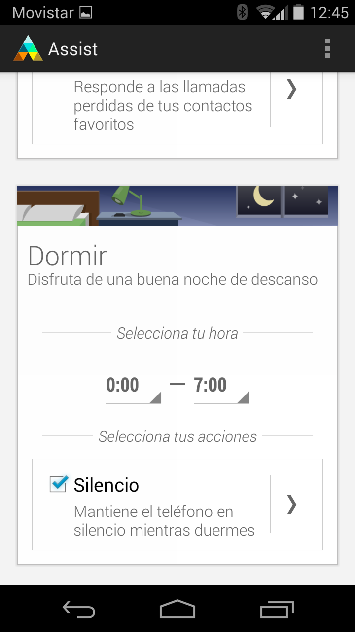Motorola Assist permite silenciar el teléfono durante reuniones, permitiendo incluso acceder a las entradas del calendario de Google para detectar reuniones. También permite silenciar el teléfono durante los períodos de sueño, para lo cual permite establecer un horario de silencio. Ofrece algunas opciones interesantes como permitir las llamadas de usuarios favoritos o de personas que llamen dos veces en menos de cinco minutos.