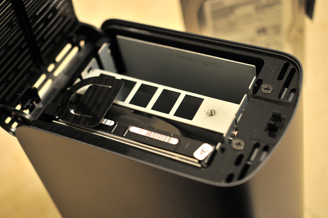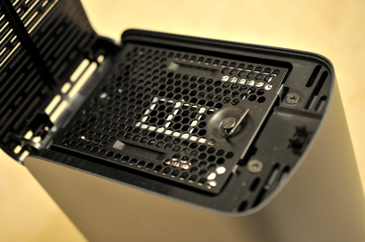Para acceder a las unidades de disco internas debemos presionar ligeramente una pestaña que abre la tapa superior. De esta forma quedan al descubierto las dos unidades de disco, que pueden extraerse fácilmente estirando de una lengüeta de plástico tras desatornillar con los dedos un tornillo que fija una cubierta metálica . Las unidades están etiquetadas como A y B para identificar fácilmente qué unidad ha fallado y reemplazar la correcta.