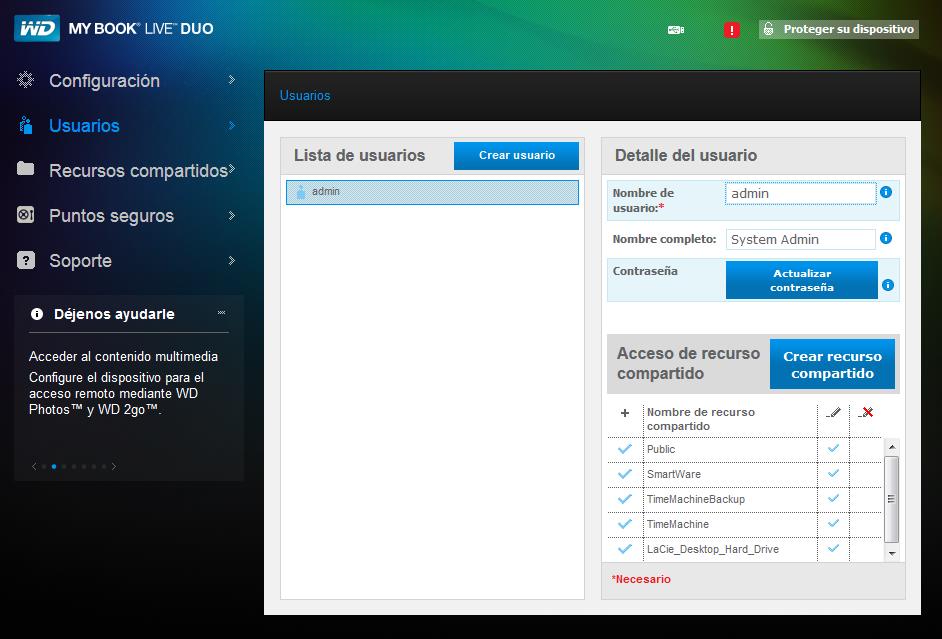 En el menú de Usuarios podemos crear cuentas para personas que tendrán acceso a My Book Live Duo.