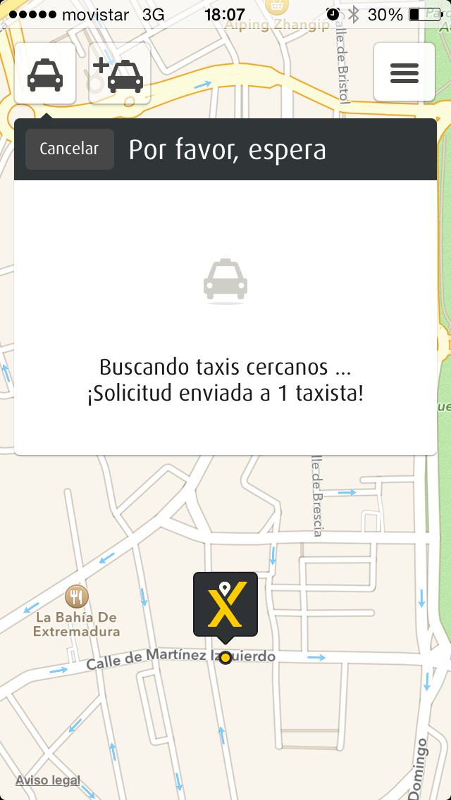 La prueba la he realizado en Madrid, solicitando un taxi alrededor de las 18:00 del día de hoy mediante un iPhone 5s. El proceso de solicitud es muy sencillo ya que la aplicación te ubica automáticamente en el mapa y, si la posición identificada no es la correcta, puedes corregirla manualmente.