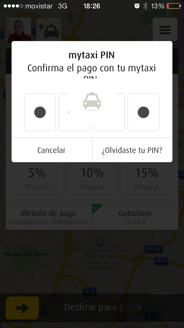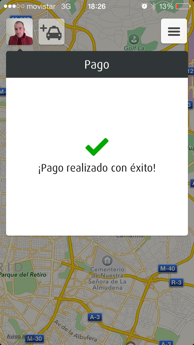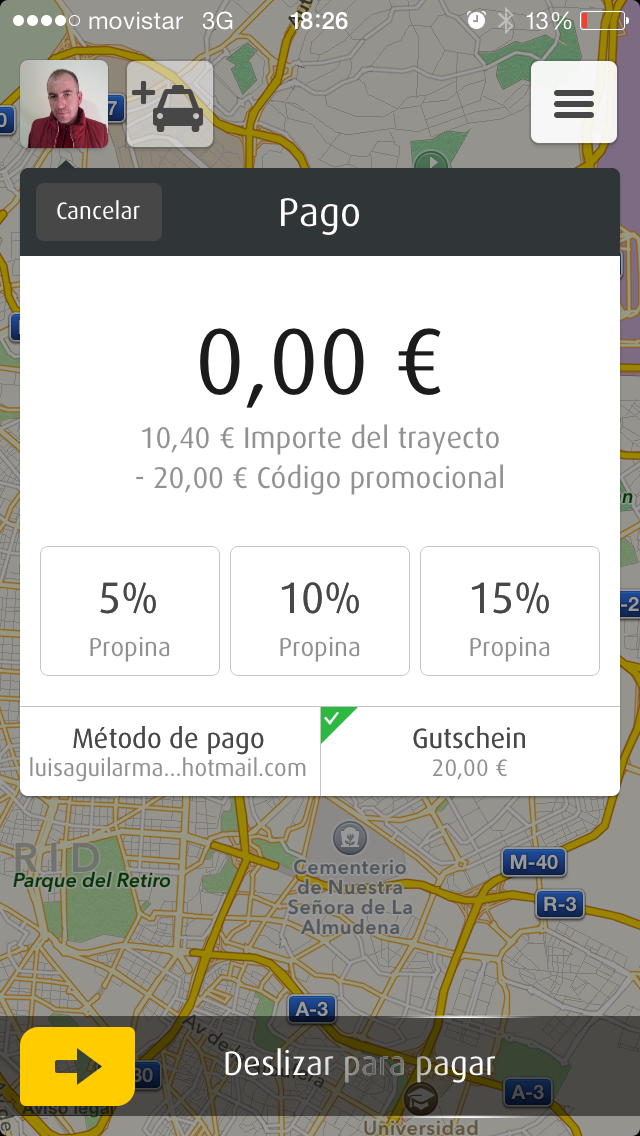 Al llegar al destino, el taxista ha introducido en su dispositivo móvil el importe a pagar y automáticamente me ha aparecido en la pantalla. En mi caso he pagado con el saldo promocional del que disponía, pero la aplicación permite configurar varias formas de pago: cuenta de paypal, tarjeta de crédito o cuentas de empresa.