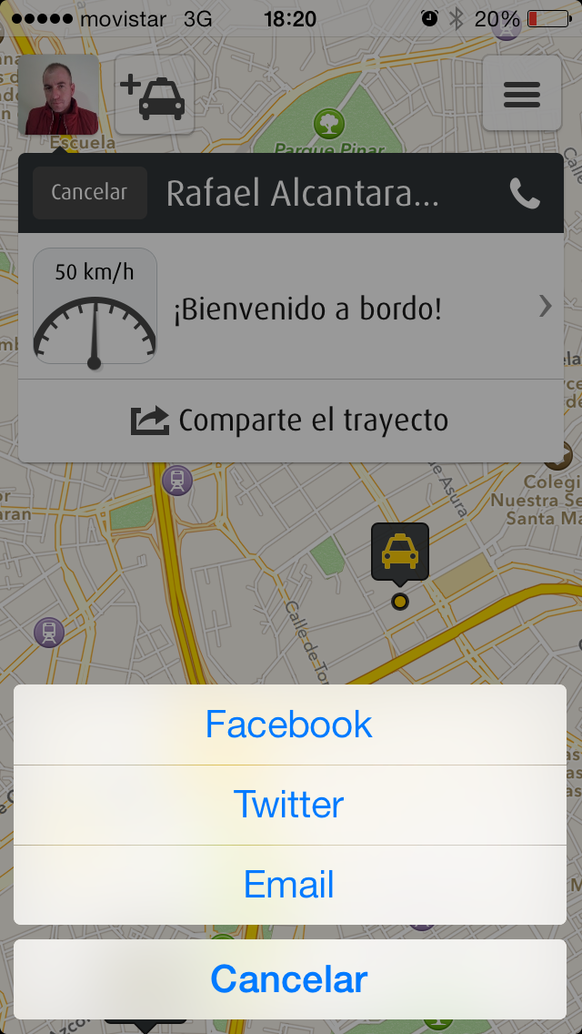 Como curiosidad, es posible compartir el trayecto vía E-Mail, Twitter o Facebook para que otras personas puedan seguir tu posición en el taxi en tiempo real. Por ejemplo, este es el link de mi trayecto.