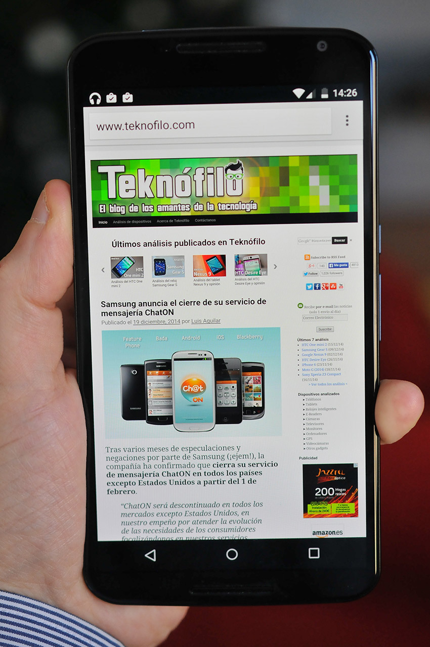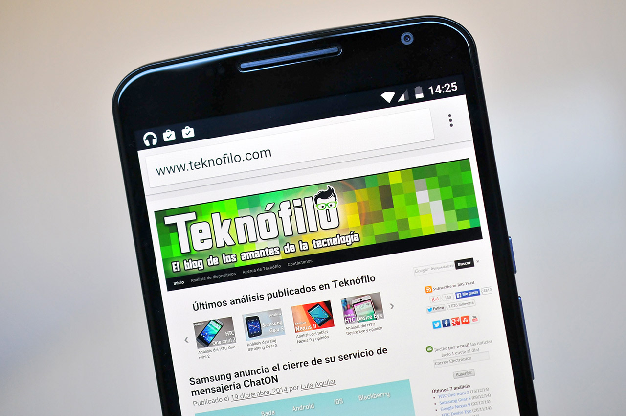 En nuestras pruebas hemos colocado el Nexus 6 (6″, 2560 x 1440 píxeles, 493 ppp) junto al Huawei Ascend Mate7 (6″, 1920 x 1080 píxeles, 369 ppp) y las páginas web con textos pequeños se ven perfectamente nítidos en ambos, sin que se note una mejora espectacular en el Nexus 6 salvo que nos fijemos mucho.