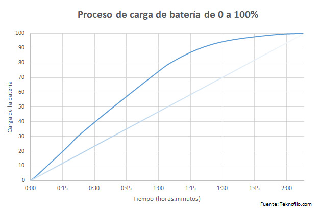 A continuación podemos ver el proceso de carga completo utilizando el cargador Quick Charge incorporado, que lleva un total de 2 horas 8 minutos. Como se puede apreciar, durante los primeros 15 minutos el teléfono carga muy rápido y alcanza un 20% de carga, suficiente para varias horas de funcionamiento.