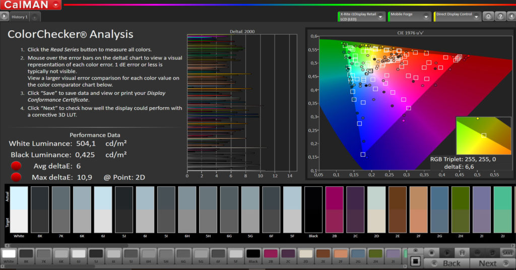 El error medio en la fidelidad de los colores es correcto, 6 dE (un valor por debajo de 4 dE se considera excelente y por encima de 9 dE se considera inaceptable), y el error máximo resulta ser de 10.9 dE, un valor algo elevado.