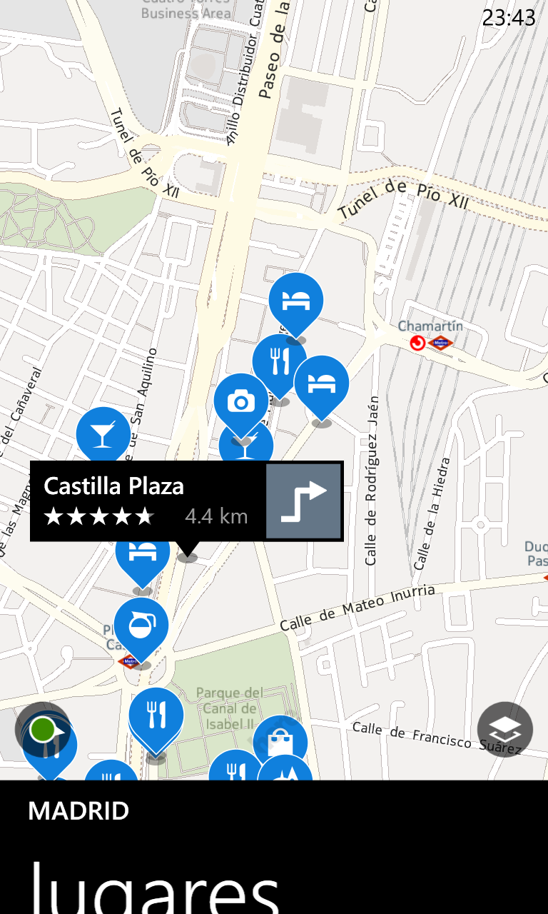 Una funcionalidad curiosa de HERE Maps es LiveSight, que buscar lugares de interés cercanos a nuestra posición y, activando la cámara, los muestra sobreimpresionados en la imagen que se captura en un modo de realidad aumentada.