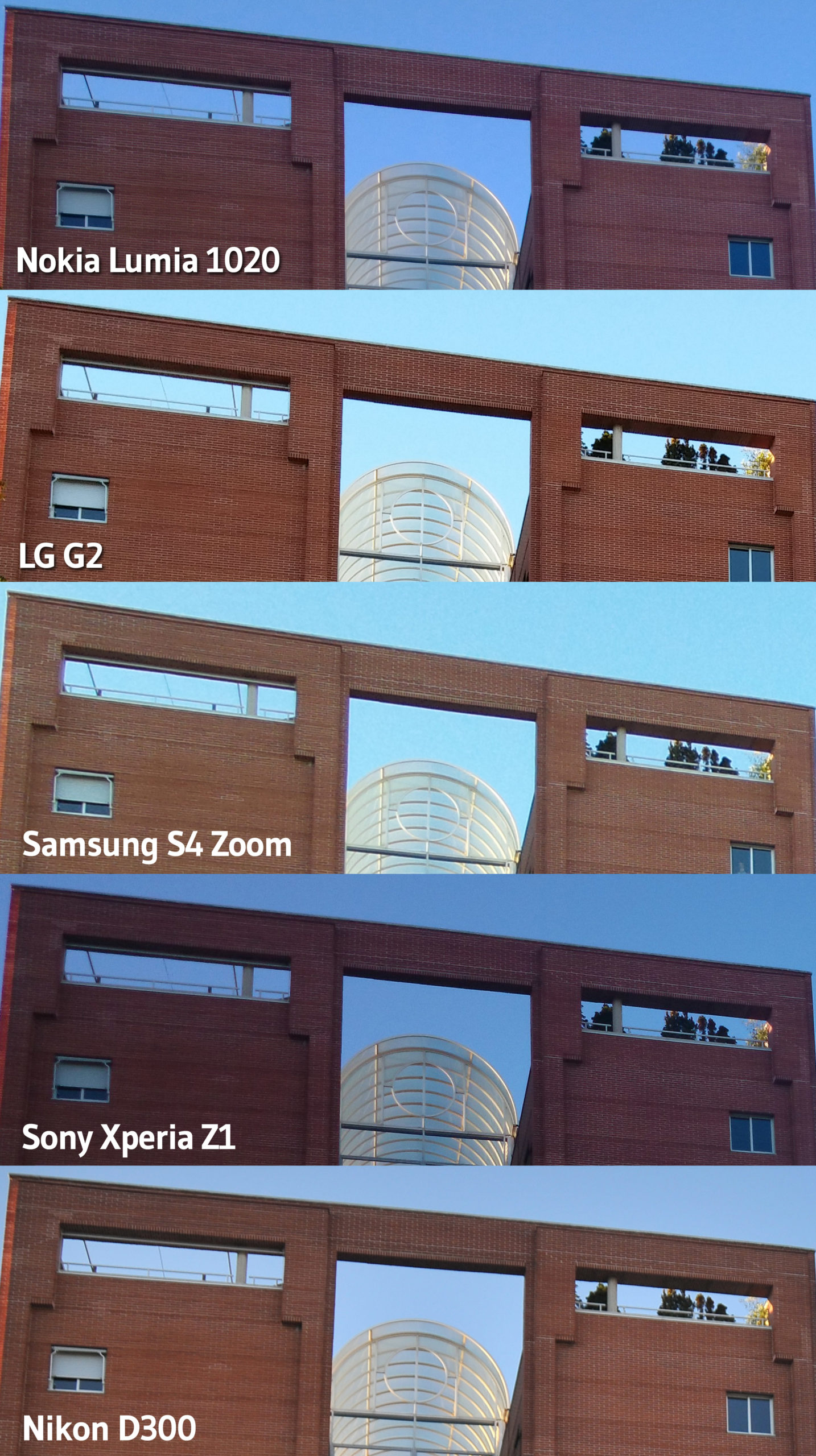 Centrándonos en la calidad de la fotografía, a continuación incluimos algunas comparativas de la misma imagen captada por el Nokia Lumia 1020, una cámara réflex profesional Nikon D300 (12,3 MP) y los mejores móviles con cámara del momento: LG G2 (13 MP), Sony Xperia Z1 (20,7 MP) y Samsung Galaxy S4 Zoom (16 MP).