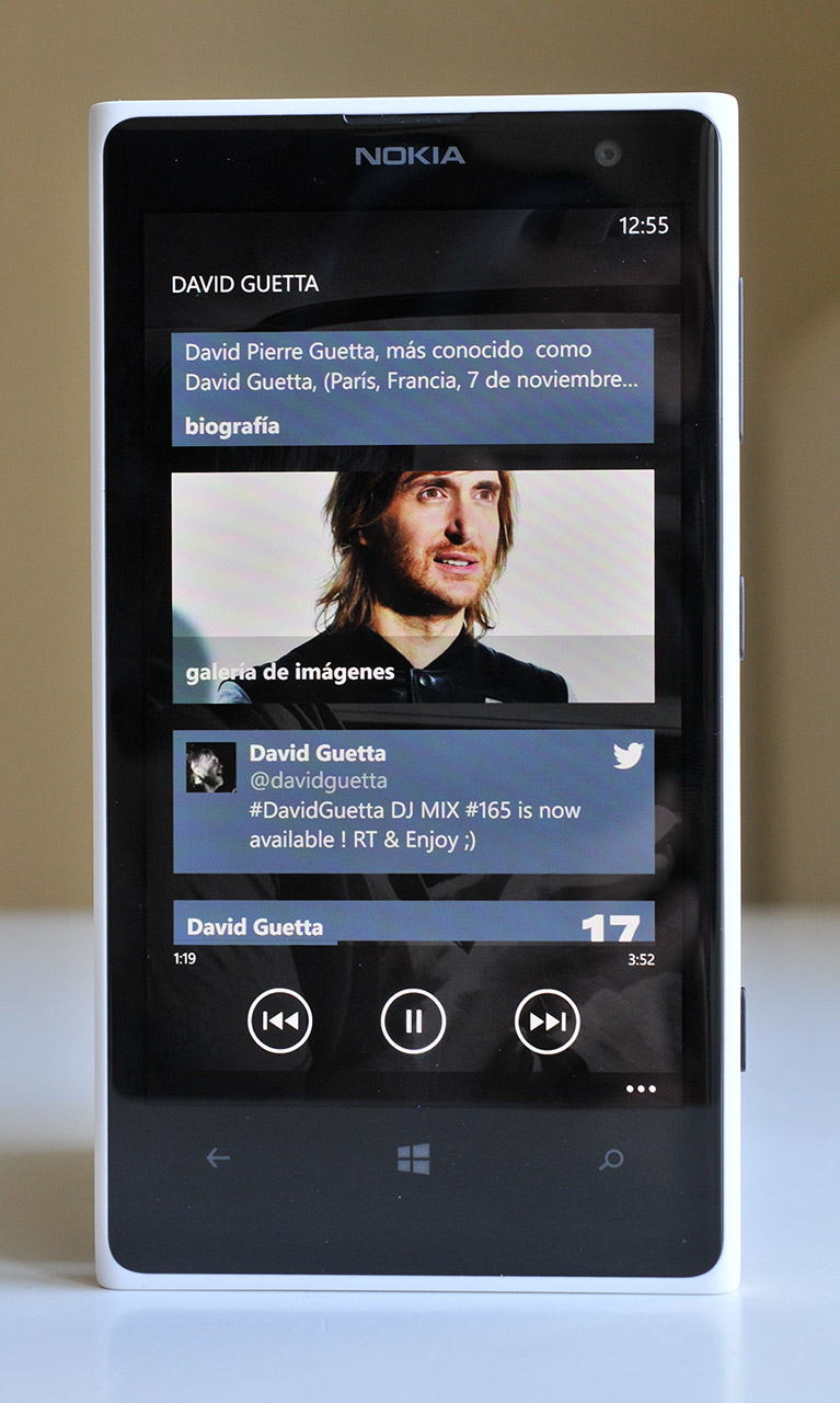 Un detalle que nos ha llamado la atención es que cuando reproduce una canción, tanto del teléfono como online, muestra una galería de imágenes del cantante, sus tweets recientes y las emisoras de radio online donde se reproducen sus canciones.