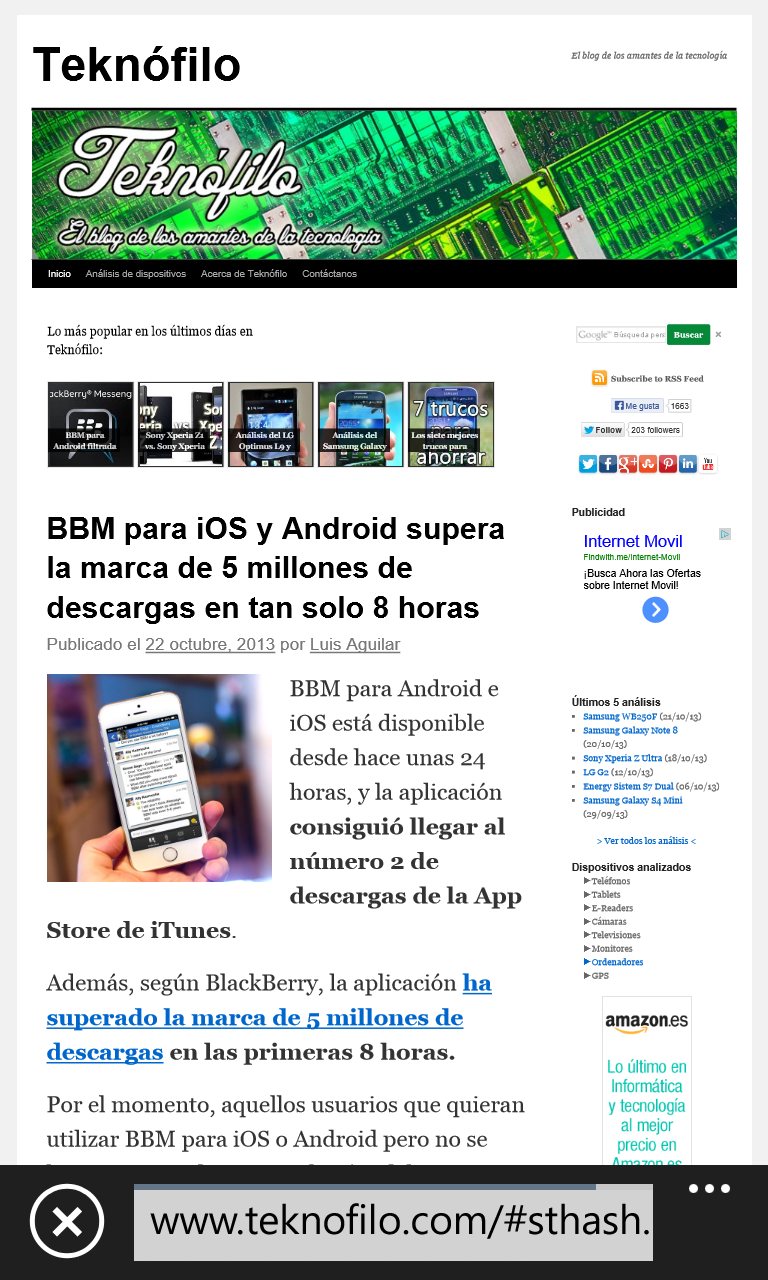 El navegador no ajusta los saltos de línea al ampliar las páginas, lo que obliga primero a aumentar el zoom y después a desplazarse a izquierda a derecha para leer líneas completas. Como curiosidad, es posible anclar una página web en una ventana de la pantalla de inicio.