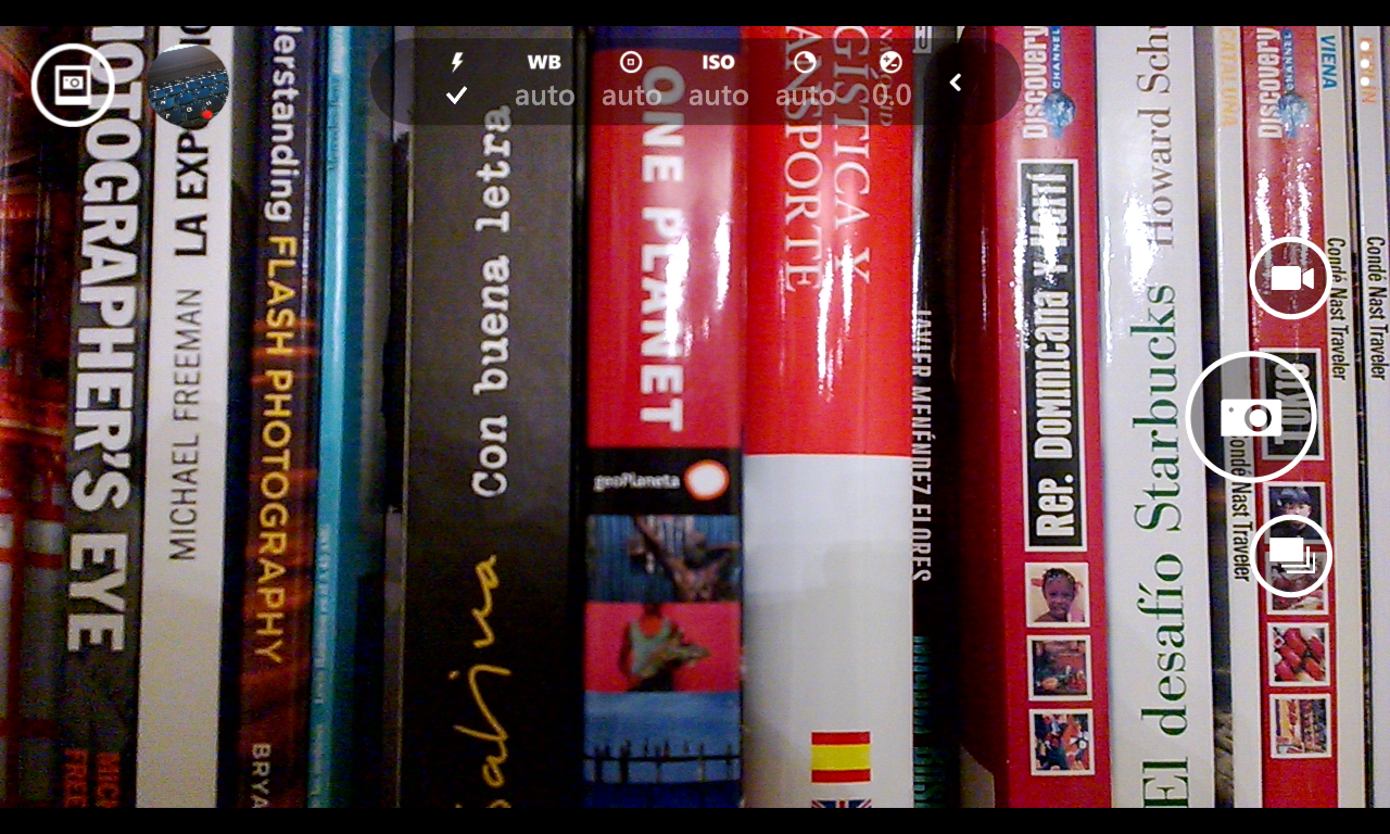 En la parte superior de la pantalla encontramos, por defecto, el control de flash (activado/desactivado), el de modo de fotografía (automático, retrato nocturno y deporte) y una flecha que expande las opciones y nos da acceso a los controles manuales de balance de blancos, enfoque, sensibilidad ISO, velocidad de obturación y exposición. Por defecto todos ellos están en Auto, pero si pulsamos uno de ellos podemos ajustarlo. En caso de que la cámara detecte que el ajuste manual no es el óptimo, muestra una línea roja debajo del parámetro supuestamente erróneo para hacérnoslo notar.