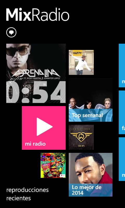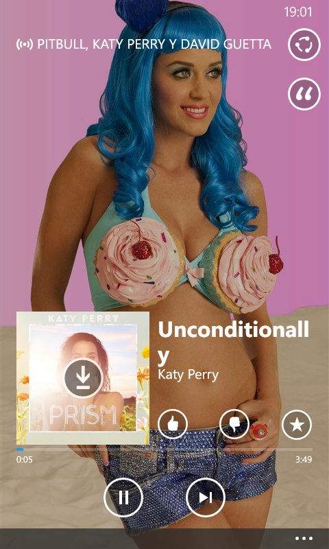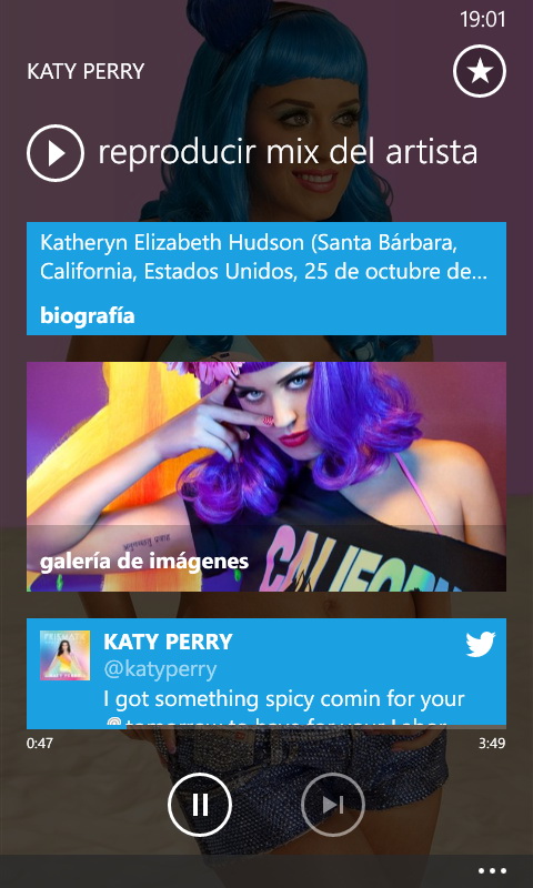 A la hora de reproducir música, Nokia MixRadio muestra información interesante sobre el artista que interpreta la canción, como su biografía, su último tweet, su próximo concierto y la lista de mezclas en las que aparece. Además nos permite iniciar una mezcla basada en ese artista con solo pulsar un botón.