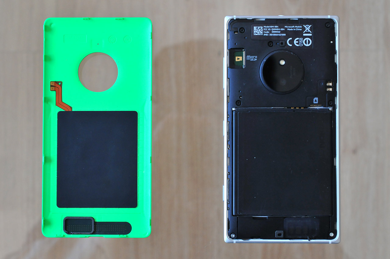 La cubierta se puede retirar, por lo que podemos acceder a la batería y a las ranuras para tarjetas nano-SIM y micro-SD. En la cubierta trasera podemos apreciar el circuito de carga inalámbrica, que permite cargar el teléfono con solo ponerlo encima de una base compatible con el estándar Qi.