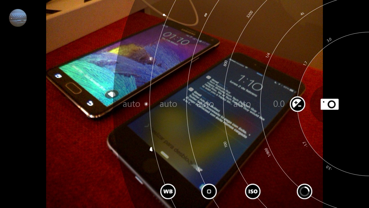 En la parte superior de la pantalla encontramos, por defecto, el cambio entre cámara frontal/trasera, el control de flash y el ajuste automático, así como una flecha que expande las opciones y nos da acceso a los controles manuales de balance de blancos, enfoque, sensibilidad ISO (hasta 3.200), velocidad de obturación y exposición.