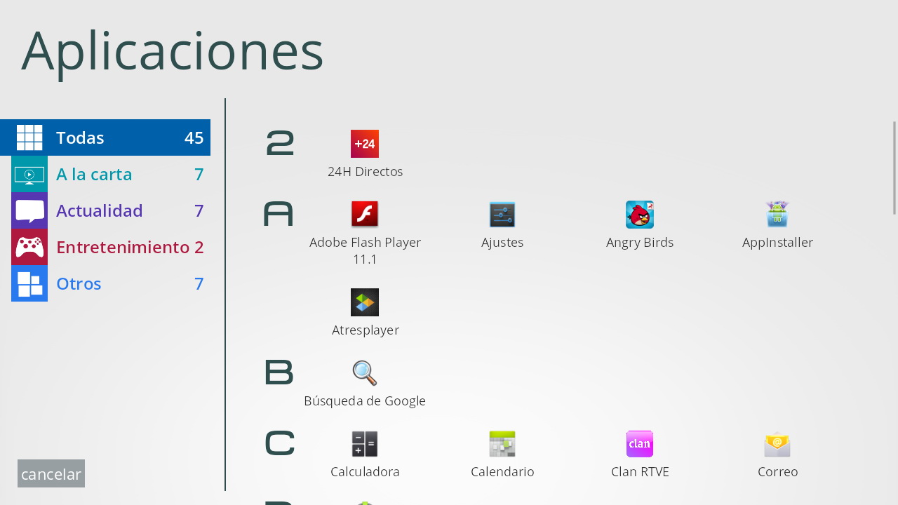 - A la carta: Atresplayer, MiTele, RTVE, Clan RTVE, Pocoyo Tube, Youtube, Yomvi y Vevo