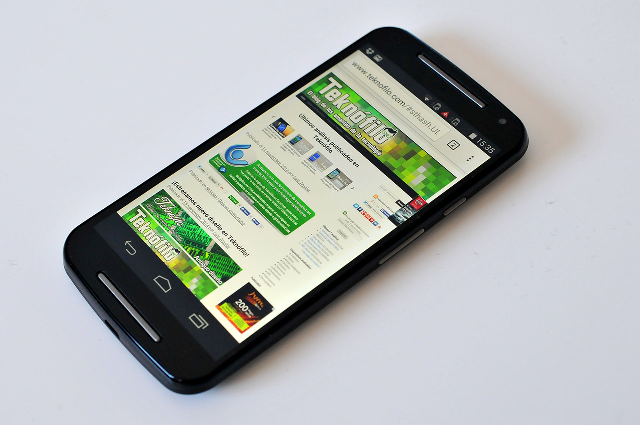 El único momento donde hemos notado la mejor resolución del nuevo Moto G frente a un teléfono 1080p es a la hora de navegar por Internet. Al colocar el nuevo Moto G (5″, 720p) junto a un Samsung Galaxy S5 (5,1″, 1080p), los textos pequeños se ven más nítidos y se leen mejor en el Galaxy S5, aunque también es cierto que la pantalla es 0,1″ más grande.