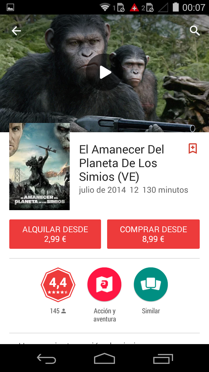 El precio de una película como El Amanecer Del Planeta de los Simios es de 2,99 € / 3,99€ (SD/HD) para alquiler y 8,99 € / 9,99 € (SD/HD) para compra.