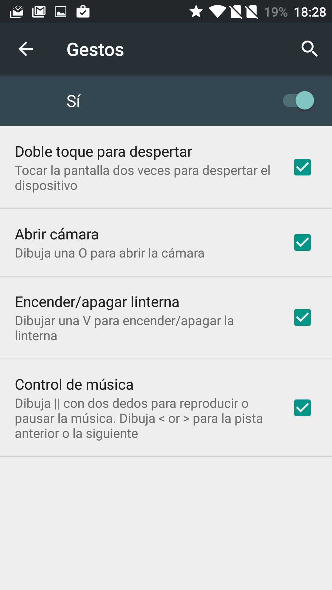 Al igual que otros teléfonos, el OnePlus 2 permite interactuar mediante gestos sobre la pantalla. Podemos despertar el dispositivo con un doble toque sobre la pantalla, abrir la cámara dibujando una ‘O’, usar la linterna dibujando una ‘V’, y controlar la música dibujando ‘||’, ‘<‘ o ‘>’.