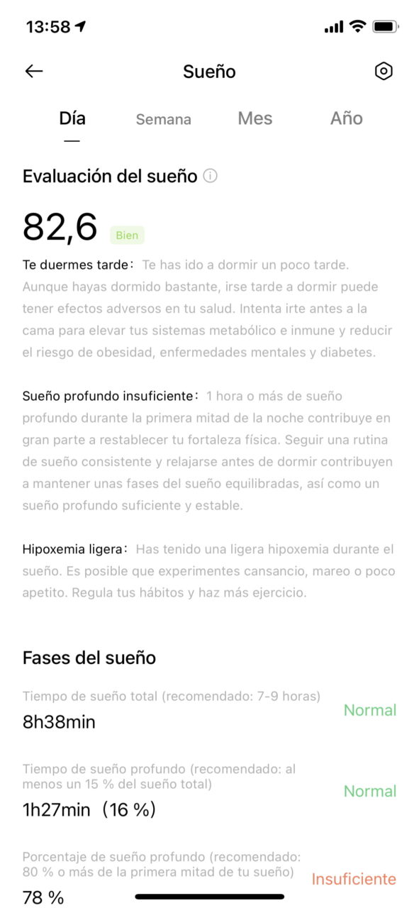 El apartado Sueño incluye información útil como el tiempo de sueño total, el tiempo de sueño profundo y el tiempo de sueño ligero. Sin embargo, la pulsera no es capaz de registrar el período REM.