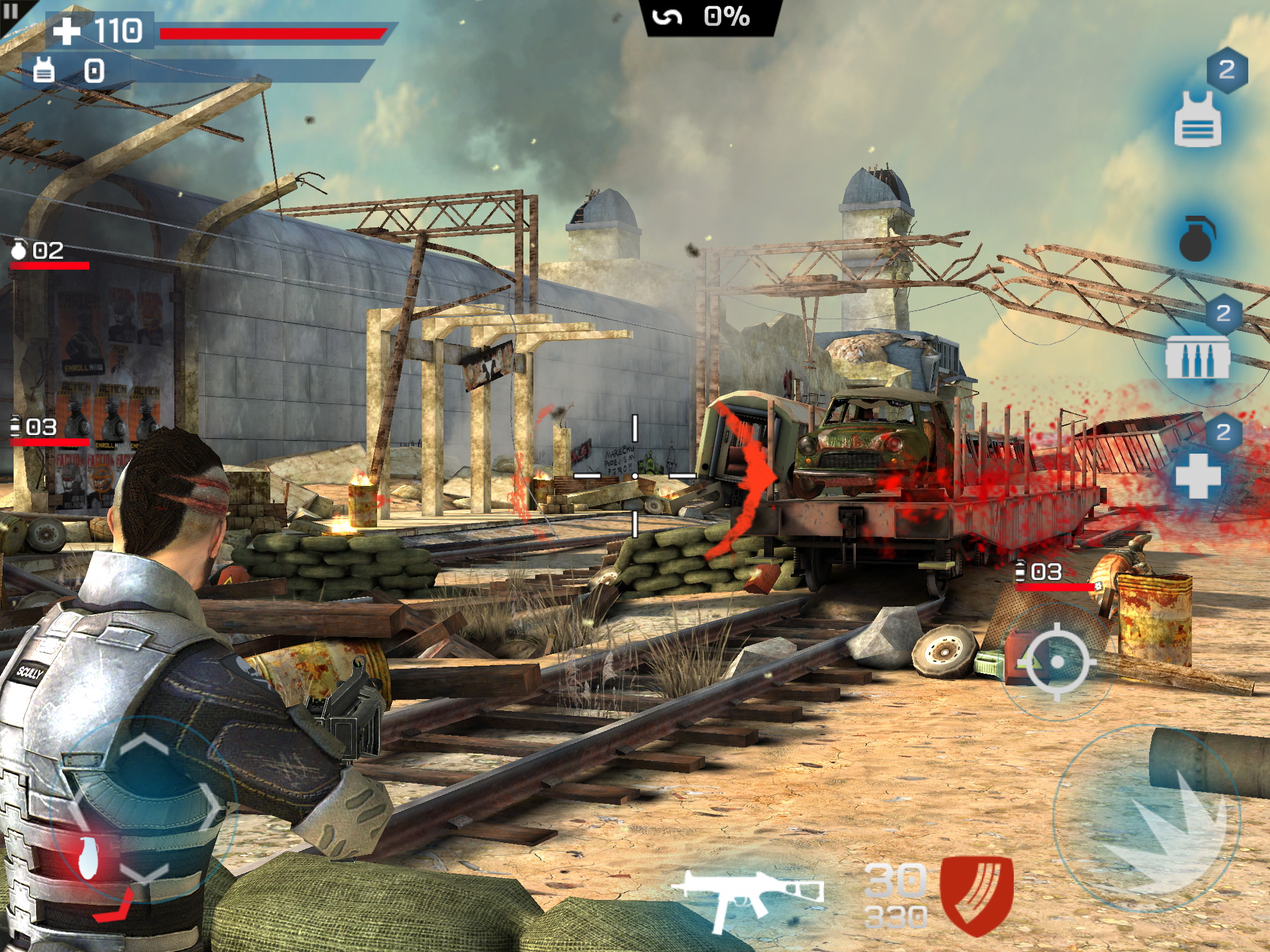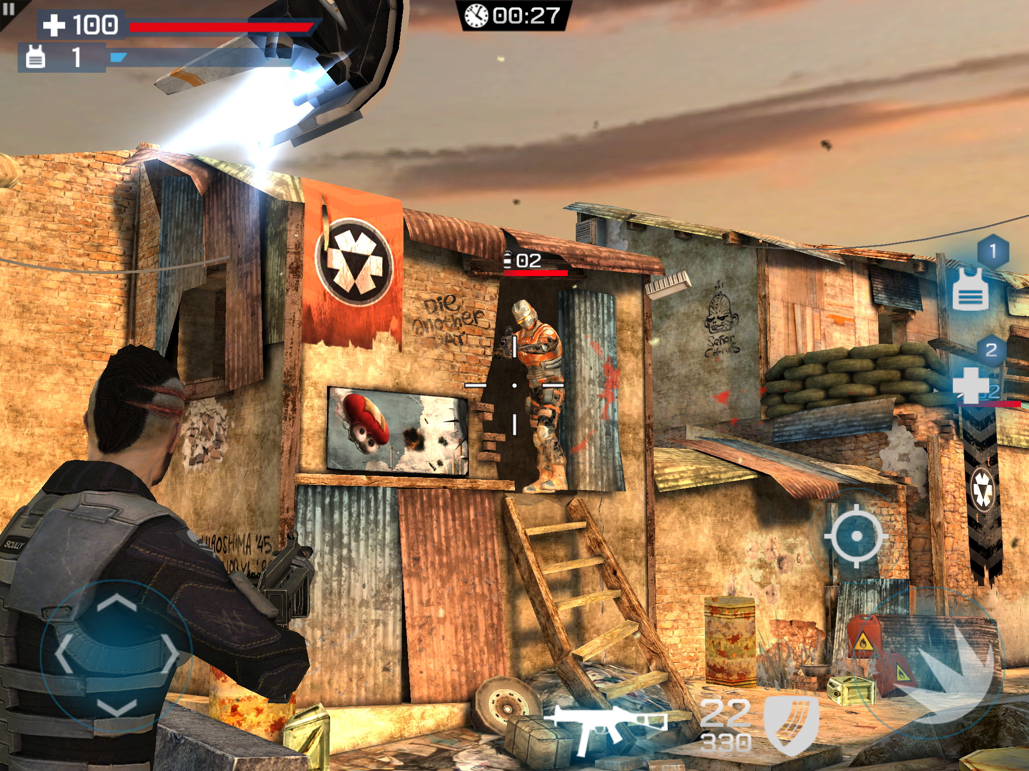 El juego incluye un tutorial que explica al jugador cómo moverse por el juego, aunque en general todo resulta bastante intuitivo. Para apuntar debes utilizar la parte izquierda de la pantalla, y para disparar aprietas un botón a la derecha. Cuando recargas te cubres del fuego enemigo, y hay incluso un botón que te permite apuntar mejor. Puedes lanzar granadas, ingerir mejoras de salud, y utilizar armas especiales como lanza-cohetes y ataques aéreos.