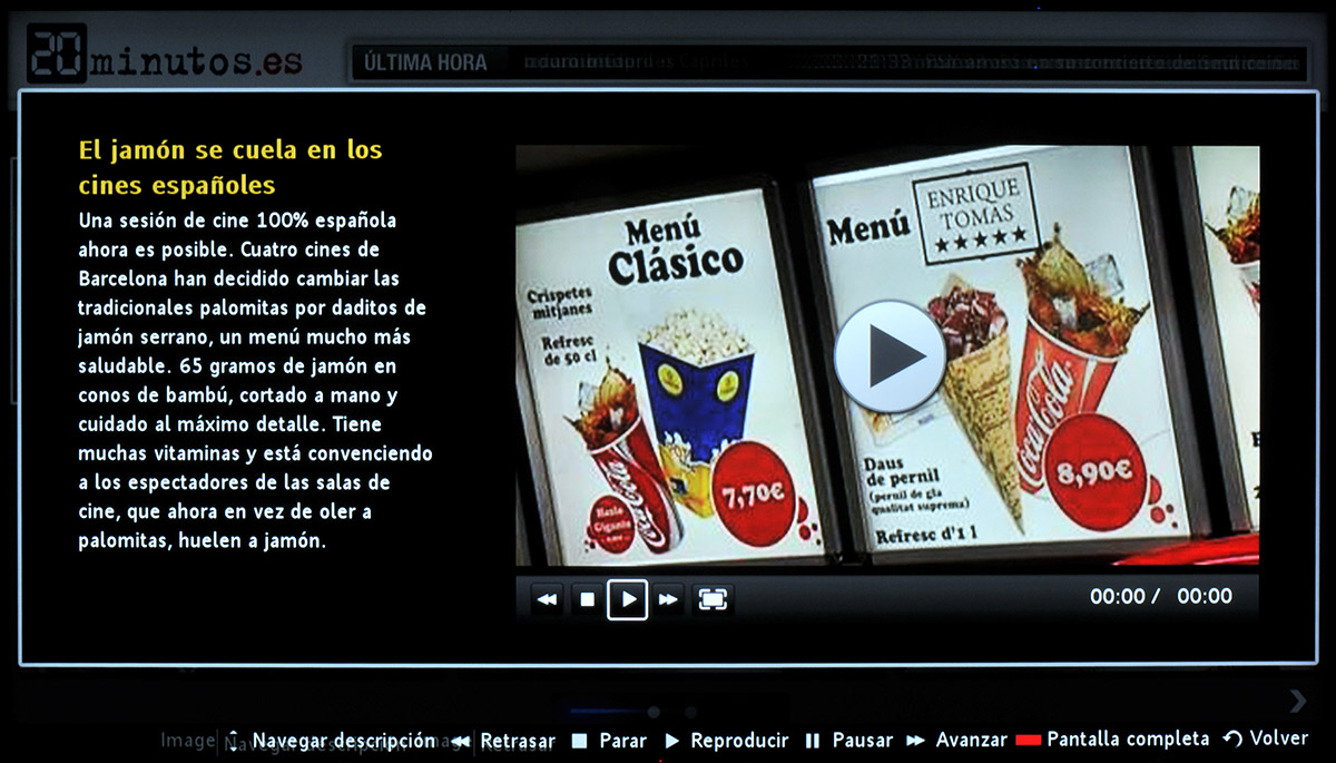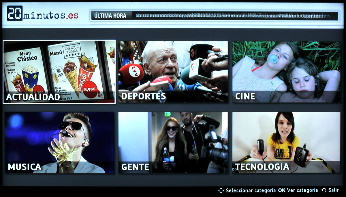 La aplicación de noticias 20 Minutos muestra las noticias del día con un interfaz adaptado a la televisión, incluyendo vídeos de las noticias.