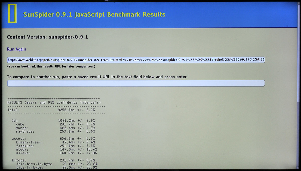 Sunspider, el famoso benchmark de Javascript para navegadores, ha dado como resultado 8256 ms. y el test BrowserMark 2.0 ha entregado 204 puntos. Ambas cifras resultan peores que las obtenidas en otros navegadores de televisión.