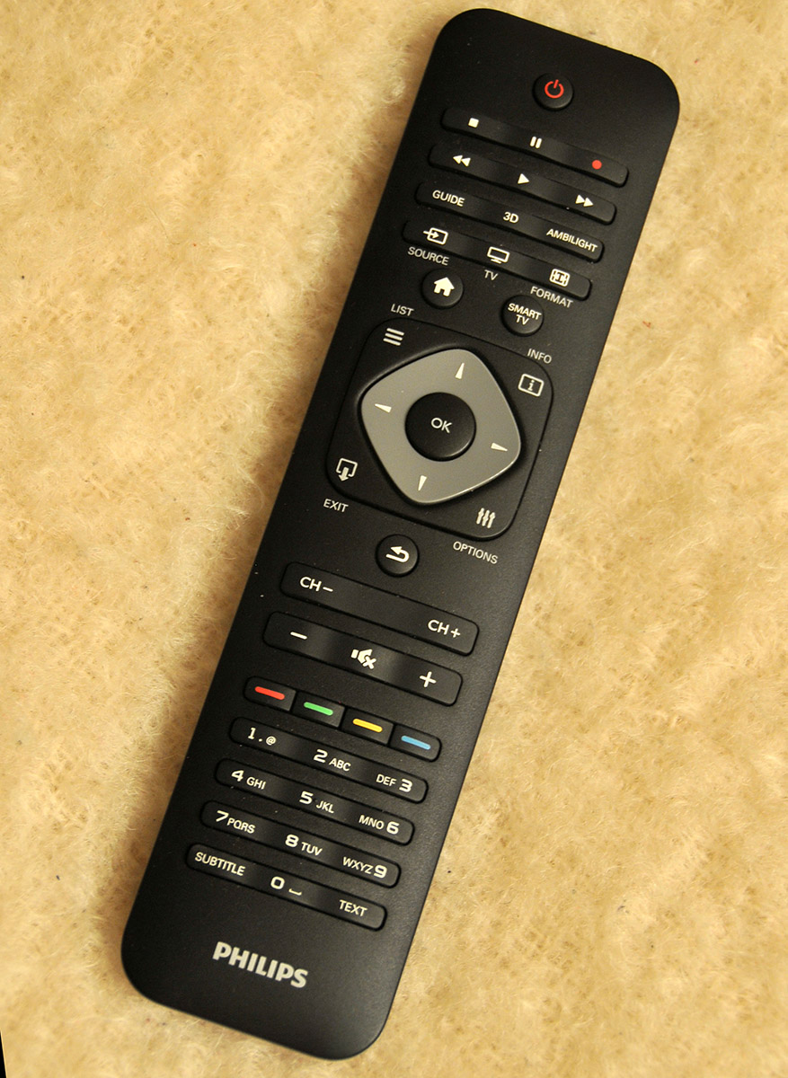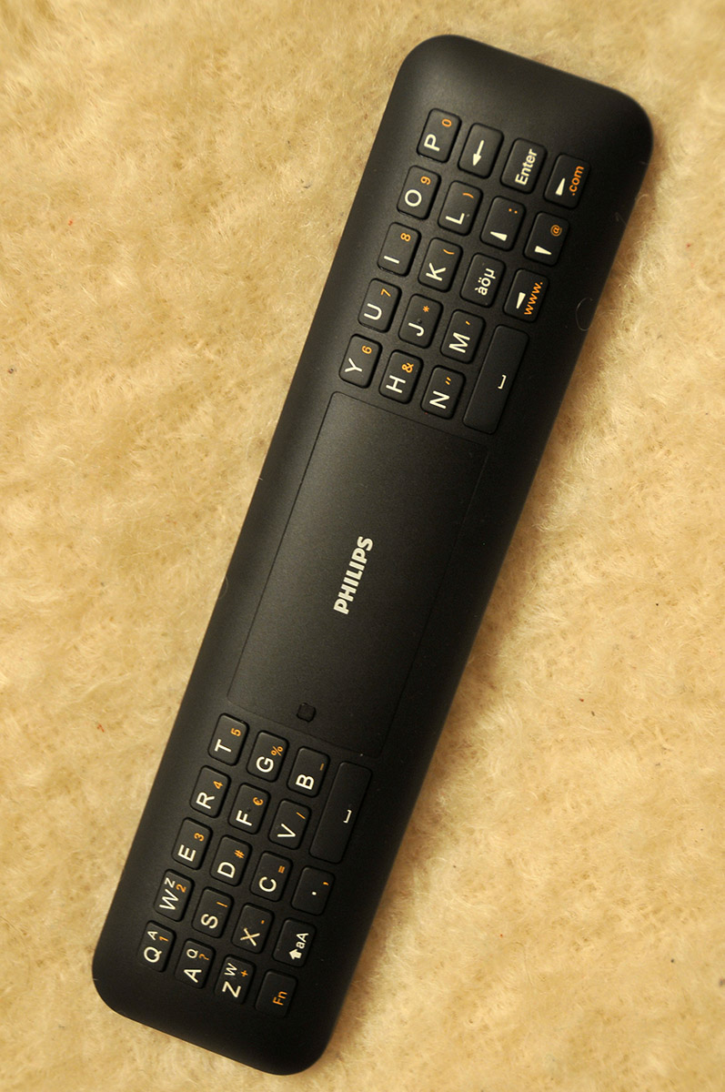 La televisión que hemos probado, Philips 40PFL7007H, incorpora un mando a distancia rectangular que por un lado muestra un aspecto convencional pero por otro posee un teclado QWERTY completo.