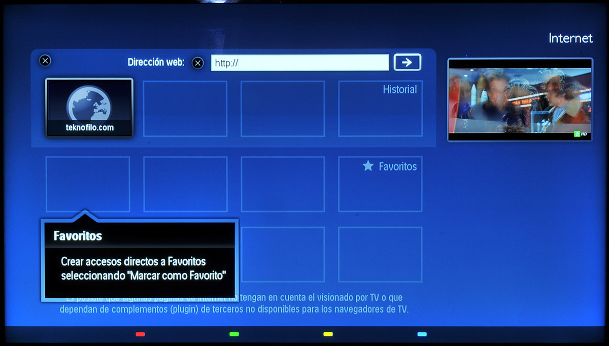 El navegador web de Philips es un navegador bastante limitado y no soporta Macromedia Flash. El navegador muestra las páginas web a pantalla completa ya que no hay una barra de herramientas.