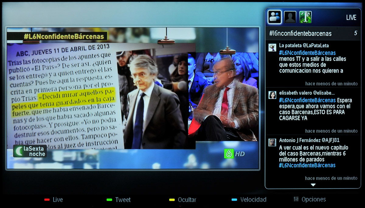 Social TV permite ver la televisión a la vez que se interactúa con los contactos de Facebook y Twitter gracias a una ventana que aparece a la derecha de la pantalla, bien sea reduciendo el tamaño del vídeo o superponiendo esta ventana sobre él, como se puede apreciar en las siguientes imágenes.