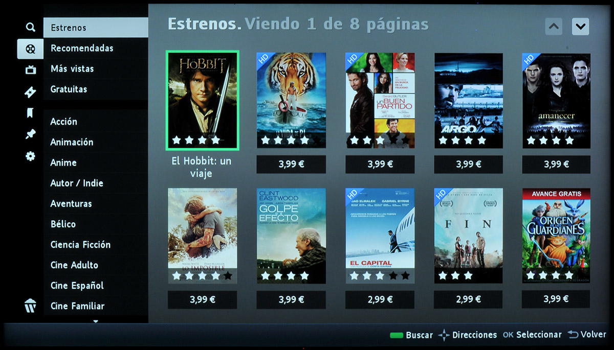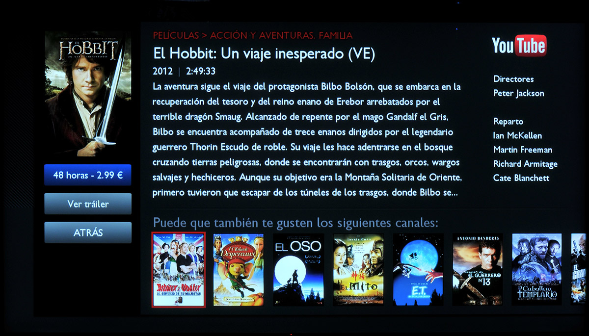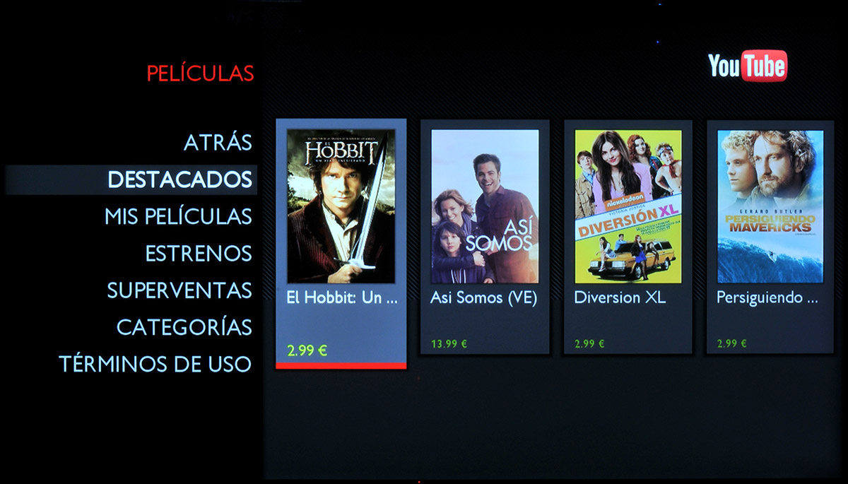 La aplicación YouTube es muy sencilla ya que únicamente permite filtrar contenidos por resolución estándar y HD, pero no admite otros filtros (como 3D) que sí que están disponibles en la página web de Youtube. Un aspecto interesante de la aplicación YouTube para Philips Smart TV que no habíamos visto hasta la fecha en otras plataformas es que permite alquilar películas.