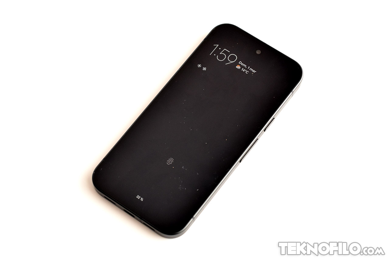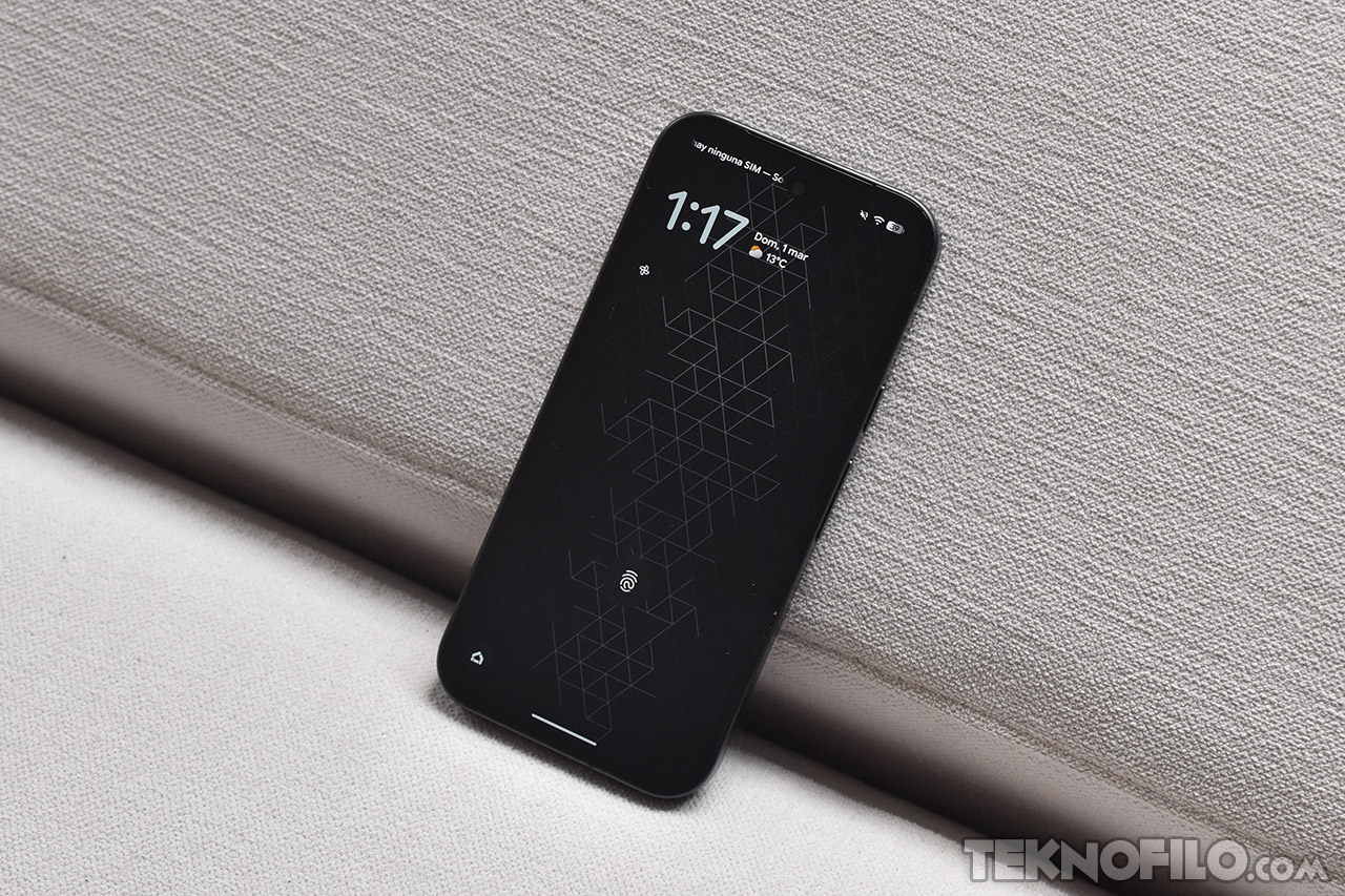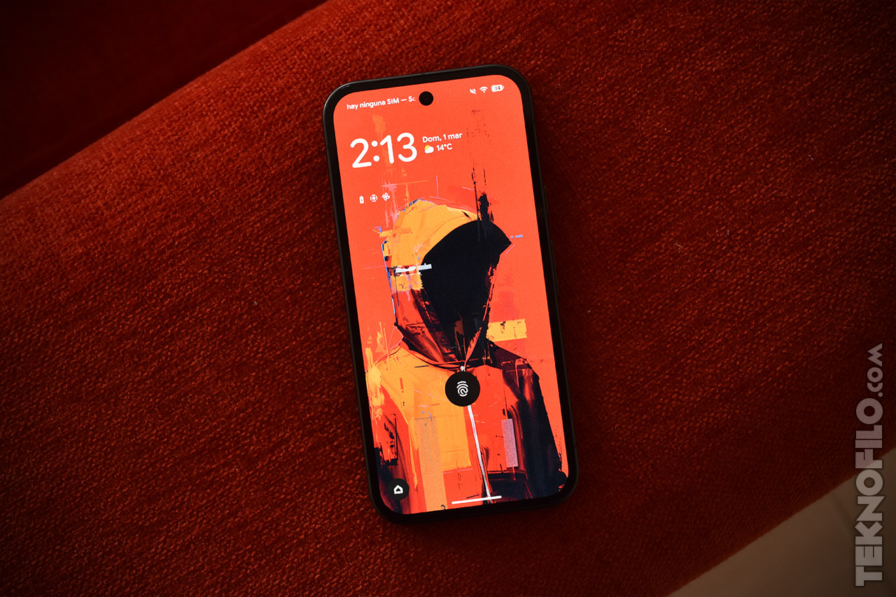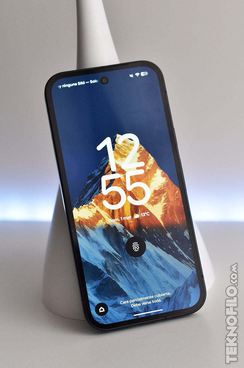 Una característica interesante de la pantalla del Pixel 10a es la función Pantalla Siempre Activa que hace que el teléfono muestre la hora, fecha, temperatura, nivel de batería, los iconos de notificaciones pendientes y el dibujo de una huella dactilar en el lugar donde debemos apoyar el dedo para desbloquear. Si activas la funcionalidad Está sonando, también puedes ver el nombre de la canción que suena cerca.