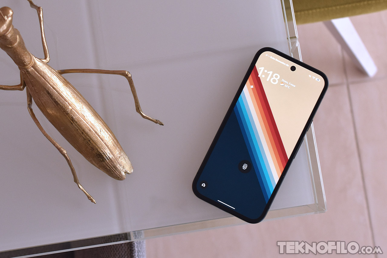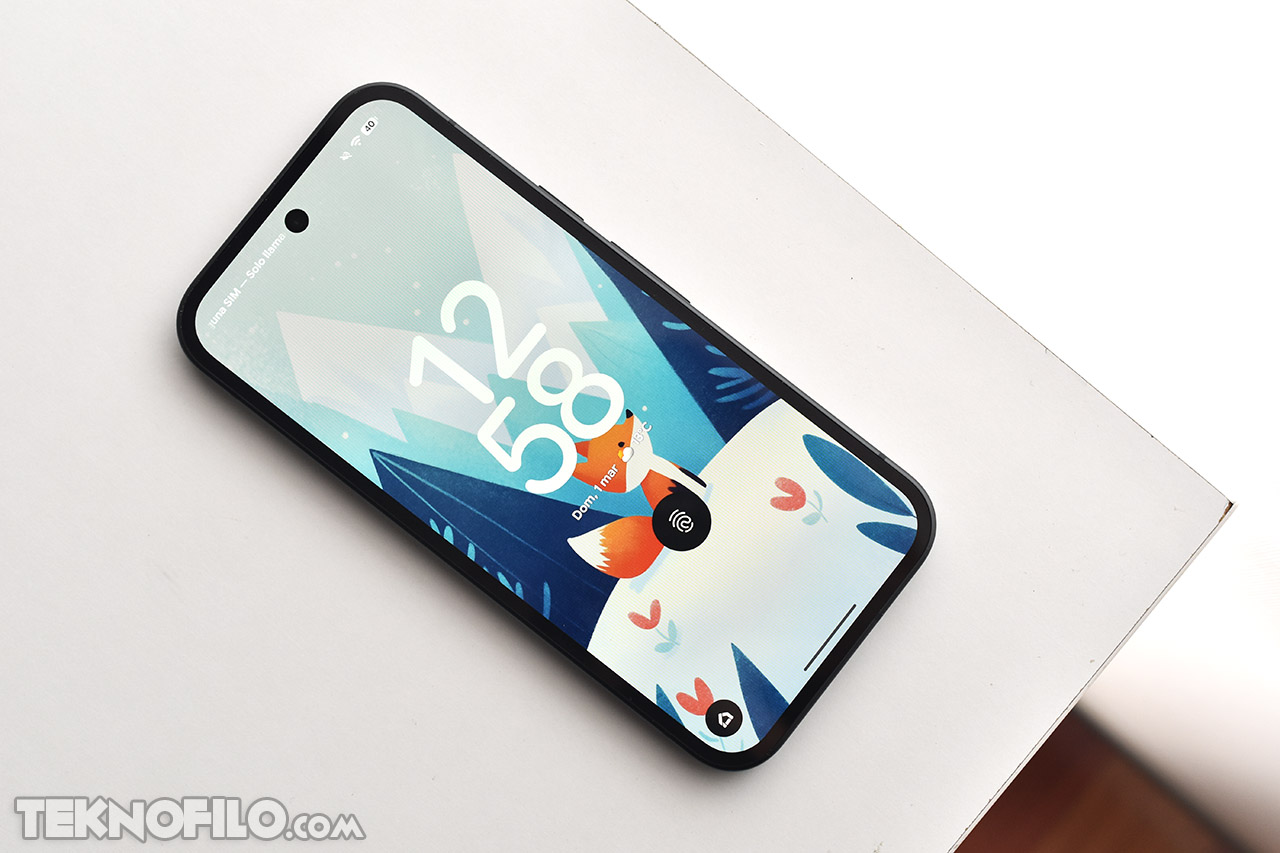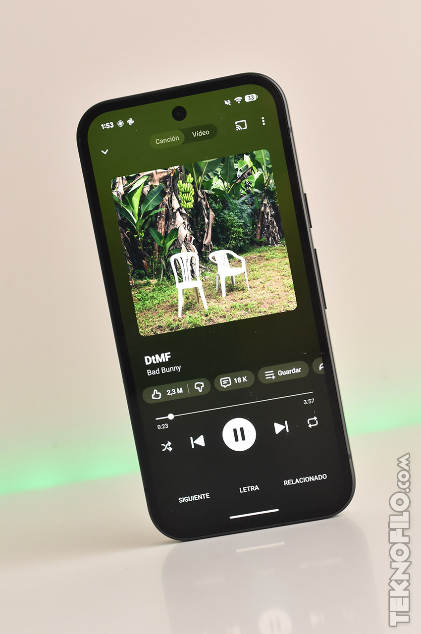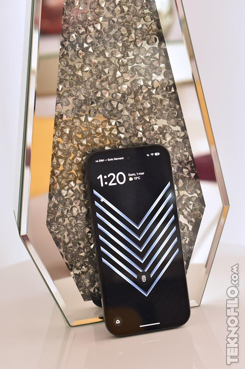 Una característica interesante de la pantalla del Pixel 10a es la función Pantalla Siempre Activa que hace que el teléfono muestre la hora, fecha, temperatura, nivel de batería, los iconos de notificaciones pendientes y el dibujo de una huella dactilar en el lugar donde debemos apoyar el dedo para desbloquear. Si activas la funcionalidad Está sonando, también puedes ver el nombre de la canción que suena cerca.