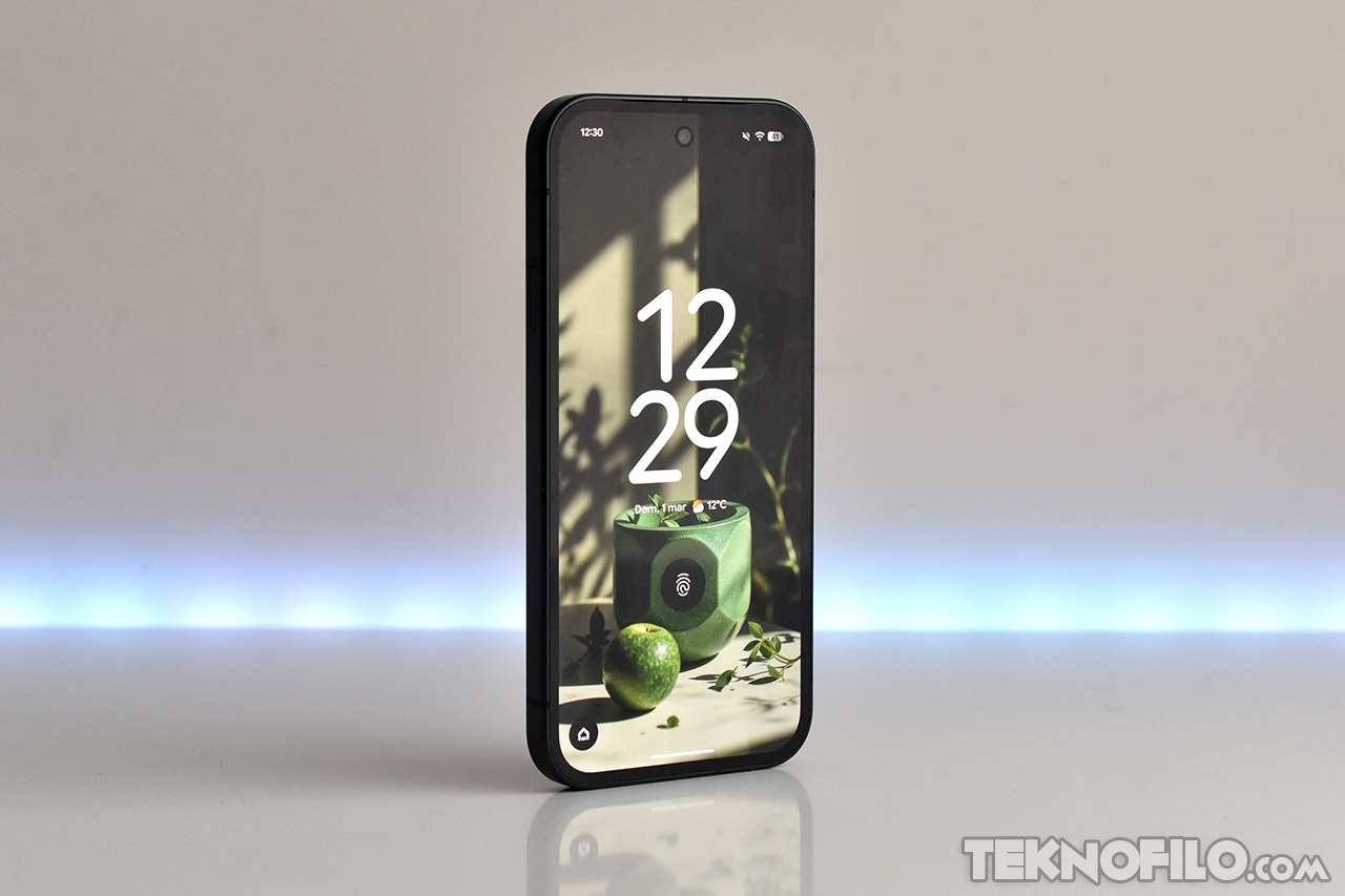 El frontal del Pixel 10a está dominado por la pantalla de 6,3″, que cuenta con un orificio centrado en la propia pantalla para la cámara frontal. Habría preferido ver este orificio en una esquina, ya que, en mi opinión, ahí pasaría más desapercibido e interferiría menos al jugar o ver películas mientras sostienes el teléfono en horizontal.