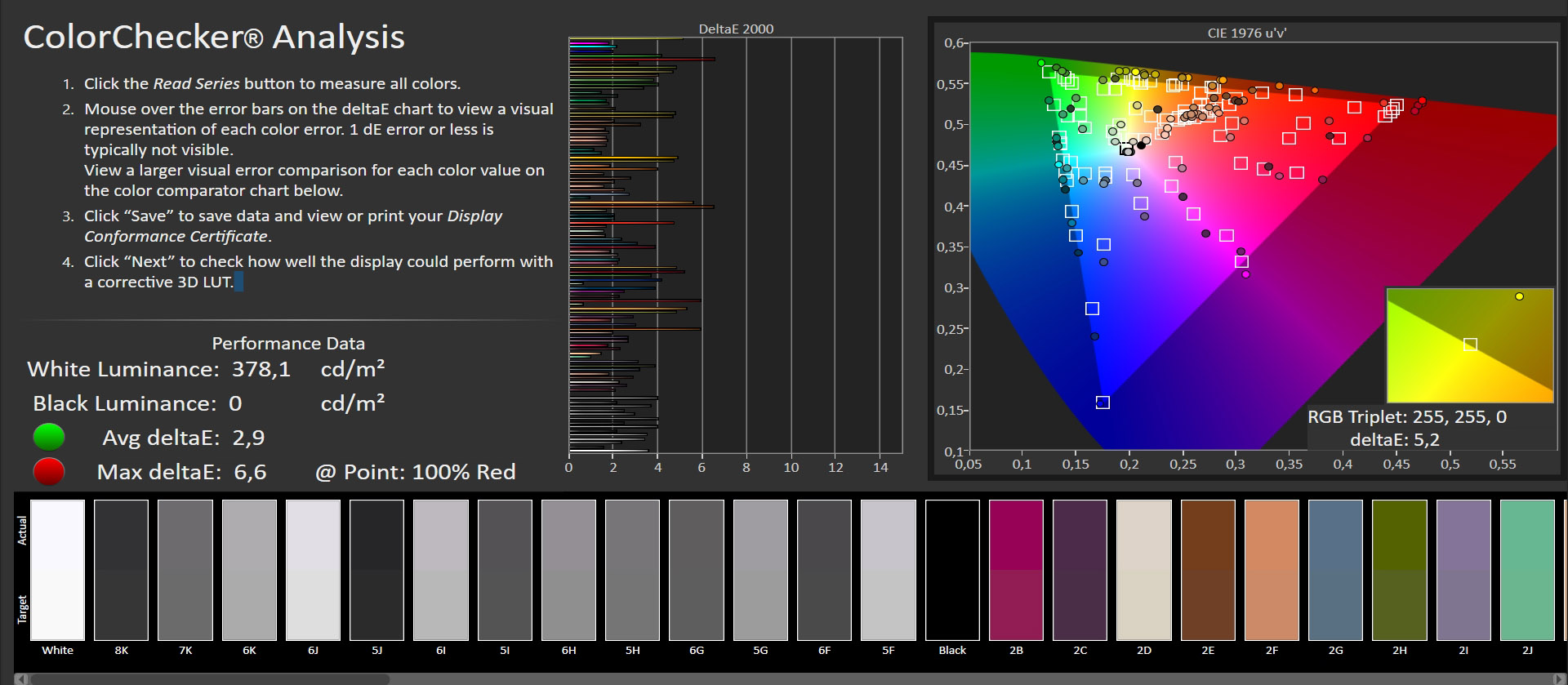 Con el modo de colores Automáticos, el error medio de en la fidelidad de los colores resulta ser 3.1 dE, mientras que con el modo de colores Mejorados, el error medio en la reproducción de colores se queda en 2.9 dE. A modo de referencia, un valor por debajo de 4 dE se considera excelente y por encima de 9 se considera inaceptable.,