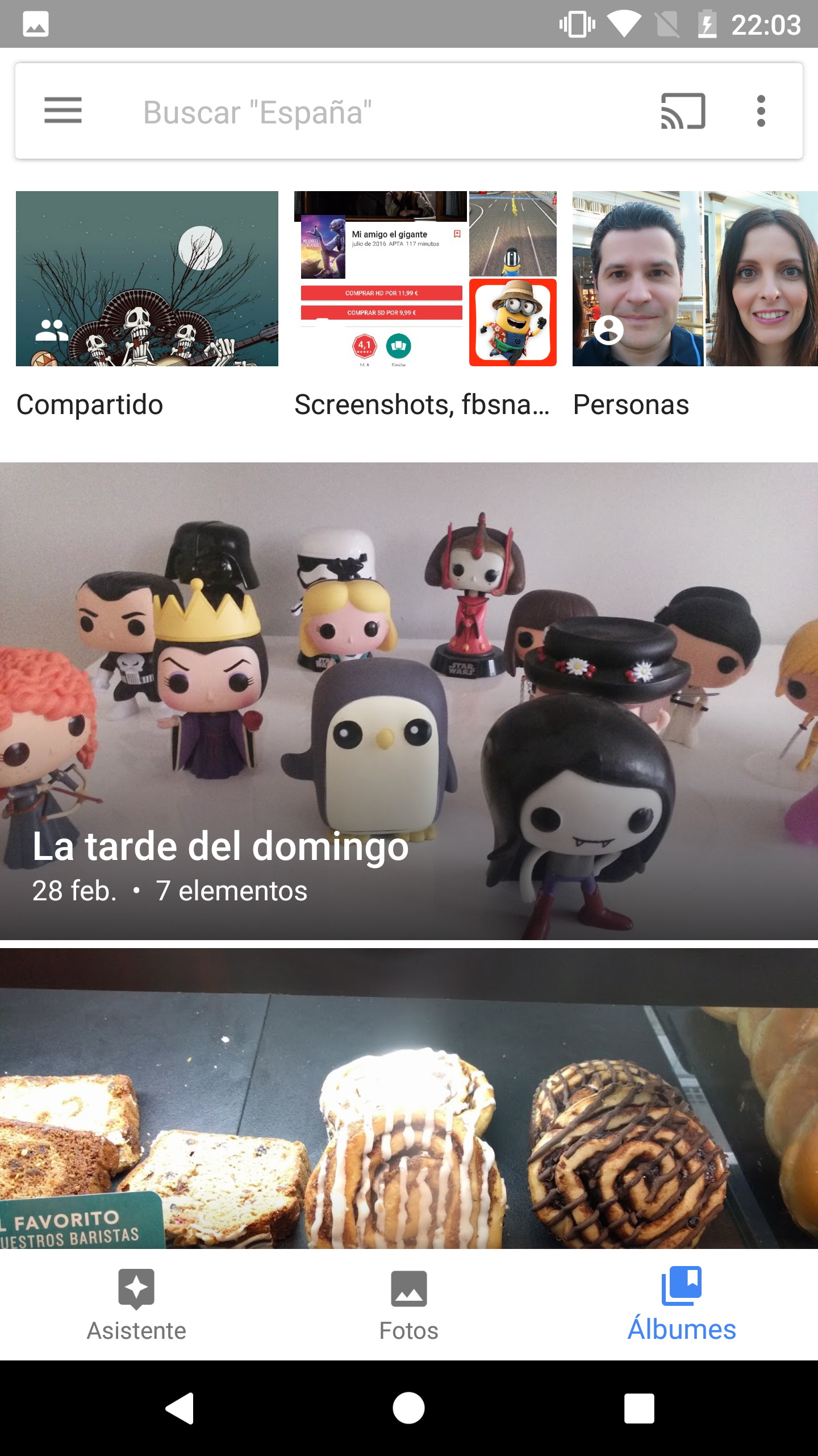En el apartado «cosas» podemos ver fotografías organizadas según elementos que ha identificado Google en las fotos. Por ejemplo, podemos ver fotos donde aparezcan «coches», «comida» o «pájaros».