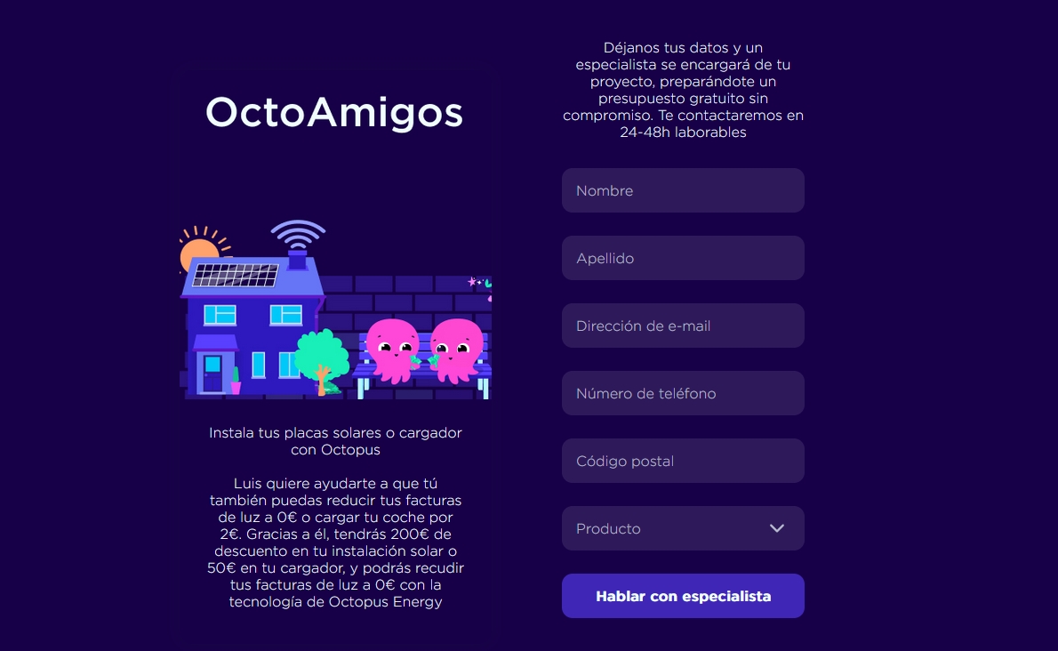Si decides instalar placas solares o cargador de vehículo eléctrico con Octopus Energy, utiliza este enlace para obtener 500€ de descuento si instalas placas solares y 50€ de descuento si instalas tu cargador.