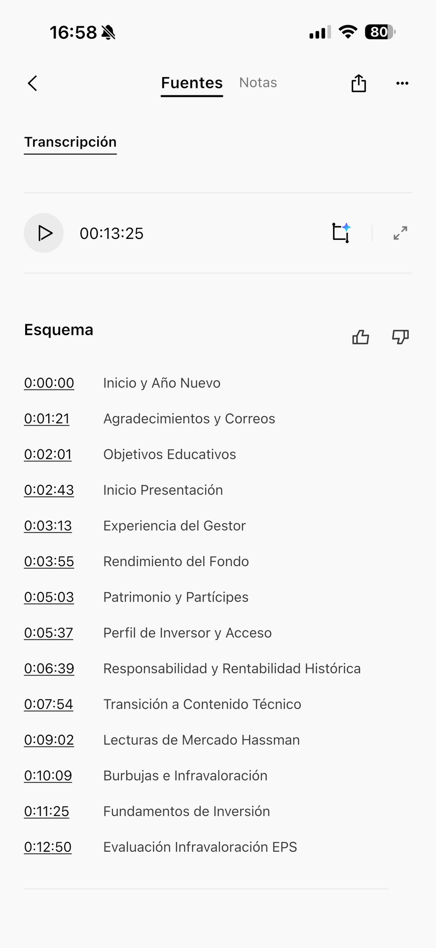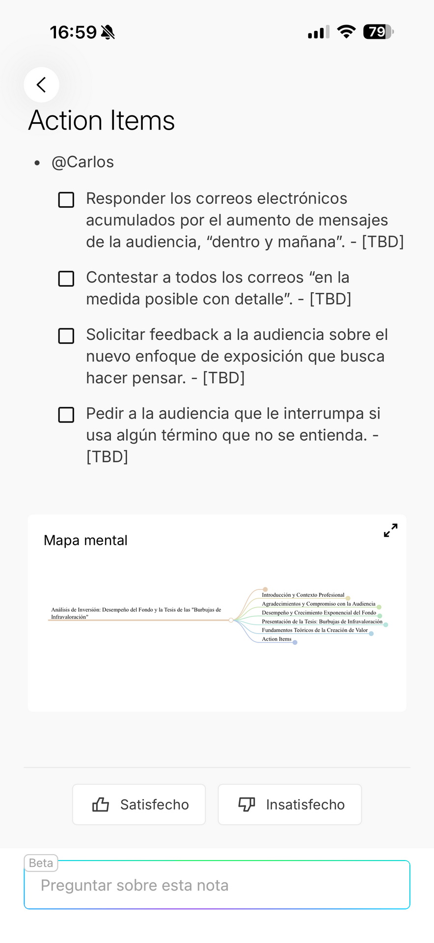 Donde realmente marca la diferencia es en la generación de resúmenes inteligentes. No se limita a transcribir: crea listas de tareas pendientes, decisiones clave, minutas detalladas, un mapa mental y más que permiten entender una reunión de 45 minutos en apenas un par de minutos de lectura.