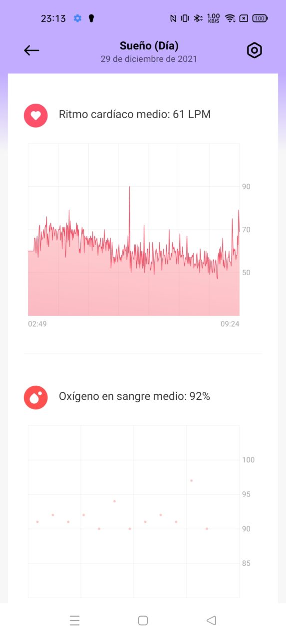 La app Sueño muestra las horas de sueño, la hora a la que te acostaste y despertaste, la media de latidos por minuto, la media de saturación de oxígeno en sangre. En el móvil se puede ver también la distribución de horas de sueño por fases y la evolución del ritmo cardíaco y oxígeno en sangre.