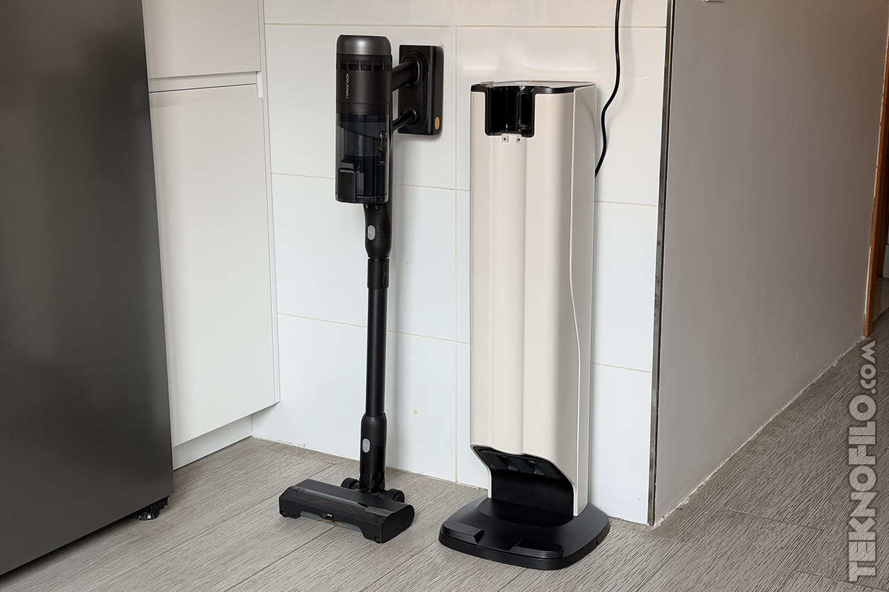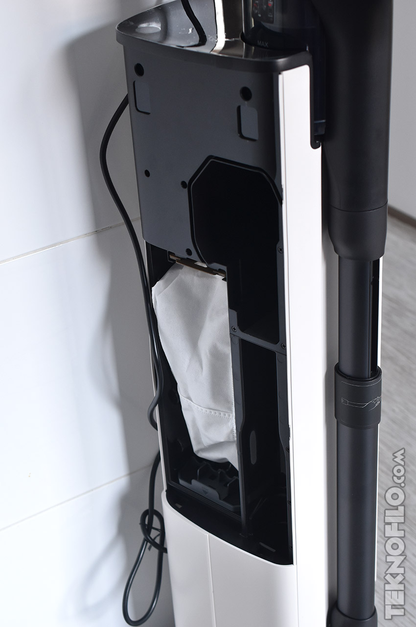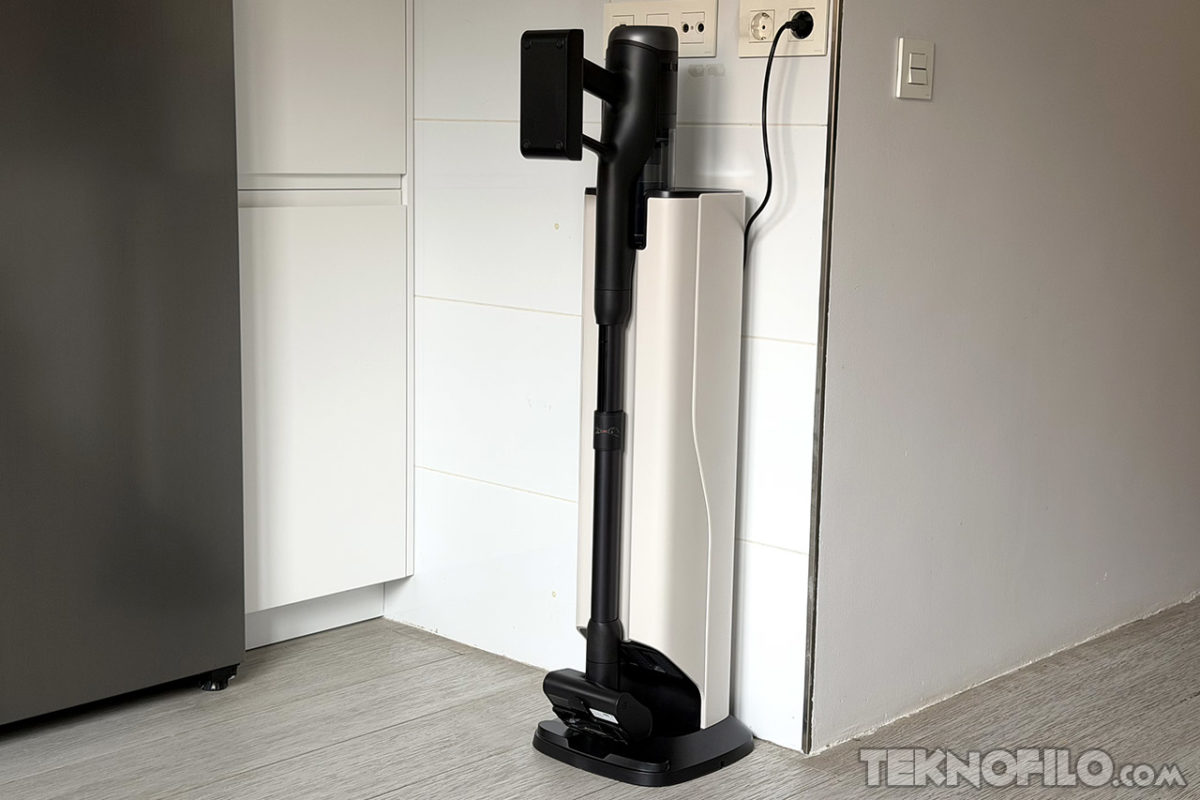 La base autovaciable está muy bien resuelta: limpia, sellada y con bolsa de 3 litros que puede aguantar semanas o meses, según uso. Además, el compartimento para accesorios es un plus para mantener todo ordenado.