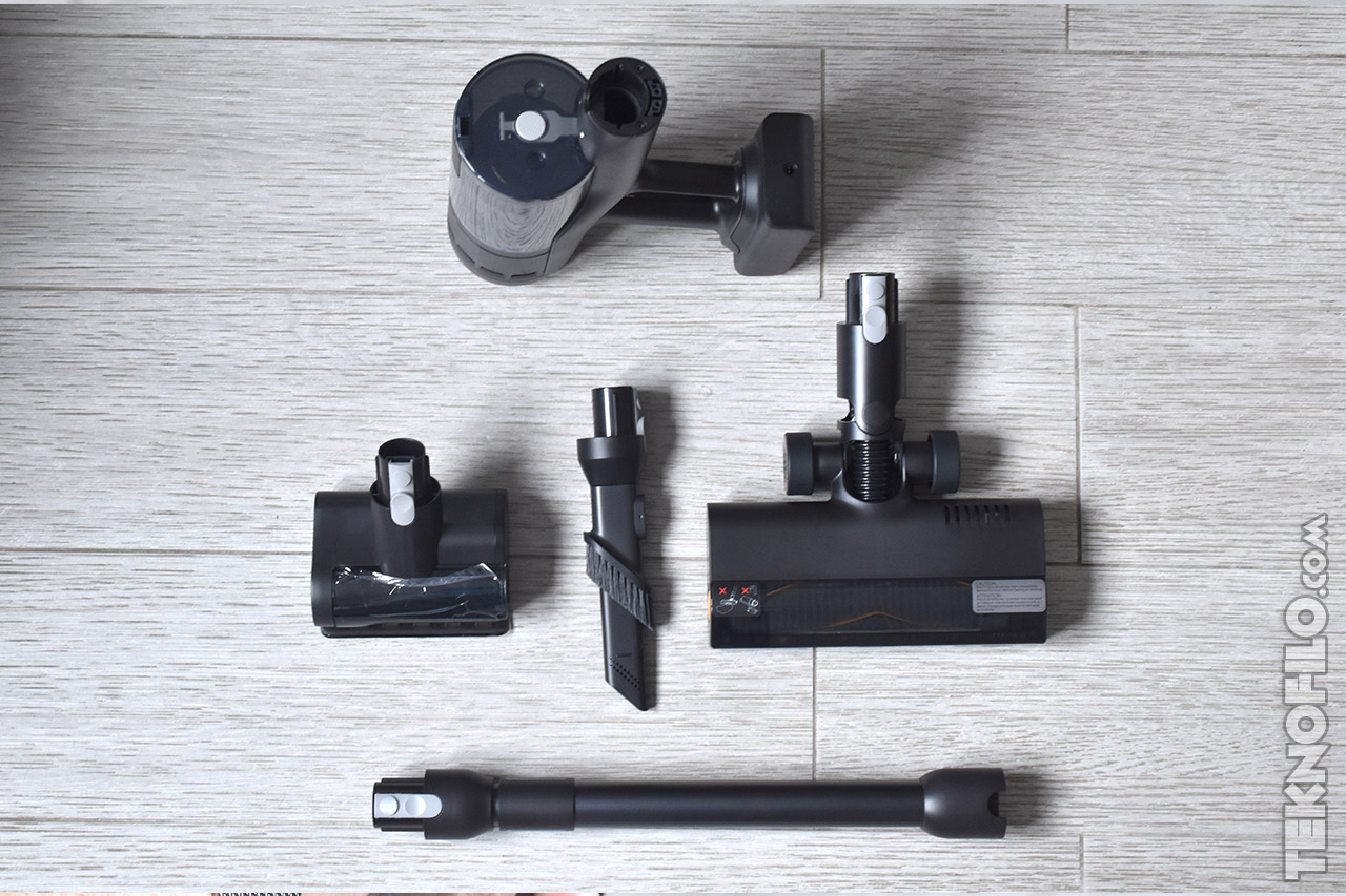 En cuanto a los accesorios, el conjunto es polivalente: boquilla estrecha para rincones, minicepillo motorizado para tela y pelo de mascota, y cepillo antienredos para el día a día. La base incluye un compartimento de almacenamiento, lo que evita tener los accesorios sueltos en cajones.