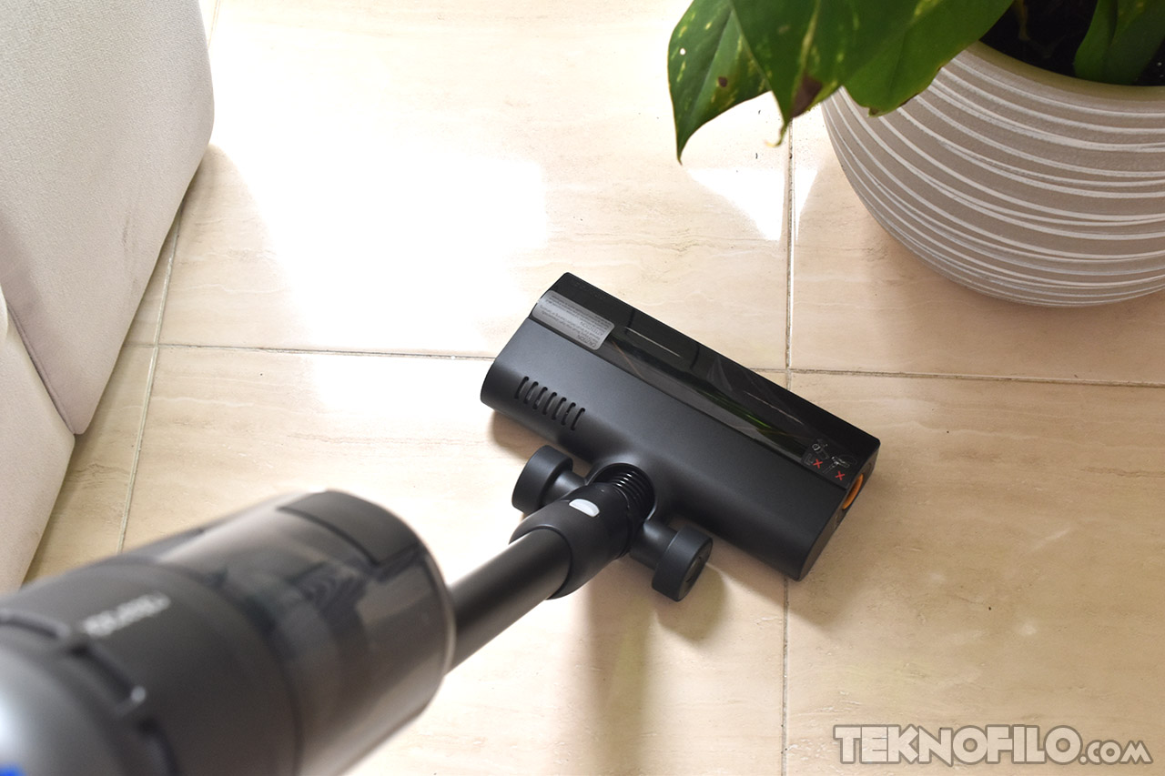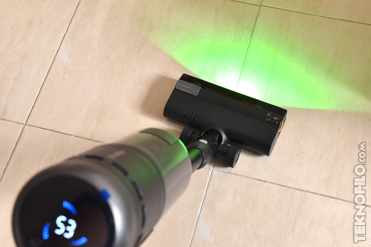 En suelos duros, el cabezal con luz verde marca la suciedad. Es especialmente útil en cocinas para resaltar restos de comida. En alfombras de pelo corto, el arrastre es bueno con el modo medio y excelente en el alto.
