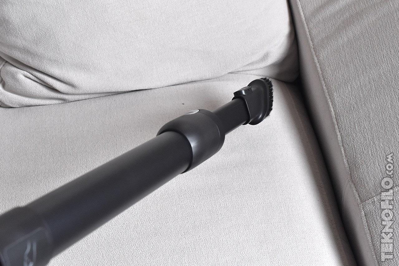 El tubo plegable resulta comodísimo para limpiar bajo sofás y camas sin agacharte. Es de esos mecanismos que usas “una vez” y ya no quieres perder, porque reduce mucho la incomodidad de limpiar zonas bajas. En escaleras, el cuerpo principal sin tubo es manejable y la boquilla estrecha permite repasar rincones de forma segura