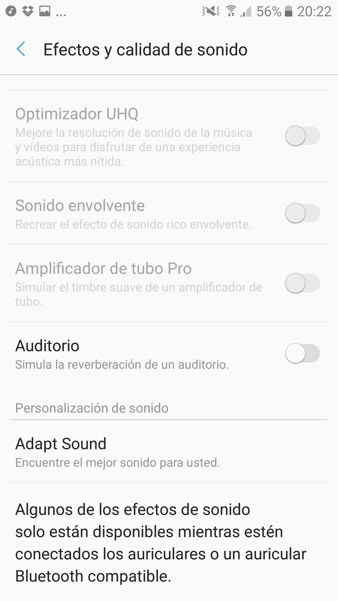 Samsung ha incorporado algunas funciones interesantes de sonido como Sound Alive para ajustar la ecualización; y Adapt Sound para calibrar el sonido emitido a través de los auriculares a la respuesta frecuencial de nuestro oído.