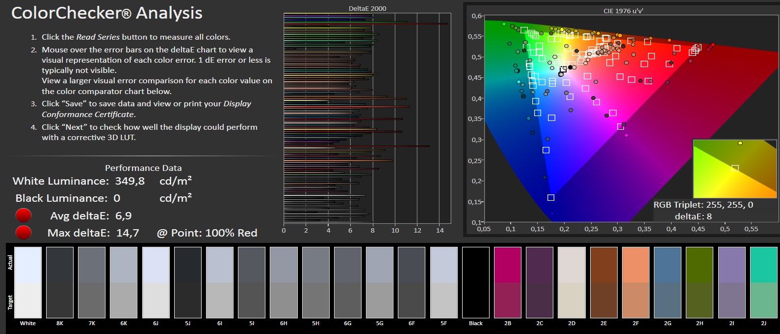 Con el modo de color activo por defecto, Adaptive Display, la fidelidad de colores no es demasiado buena ya que la pantalla tiende a saturar los colores en exceso. El error medio resulta ser 6.9 dE (un valor por debajo de 4 dE se considera excelente y por encima de 9 se considera inaceptable), y el error máximo resulta ser de 14.7 dE, un valor bastante elevado.